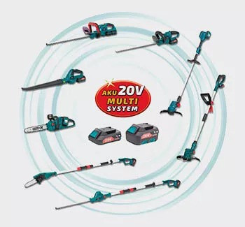 A fűrész az AKUMULTISYSTEM 20V sorozathoz tartozik. A programhoz tartozó összes kerti eszköz és szerszám ugyanarról az akkumulátorról táplálható.