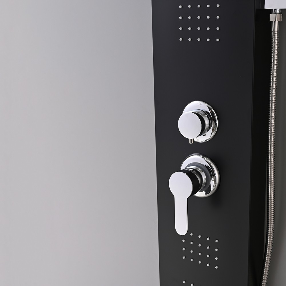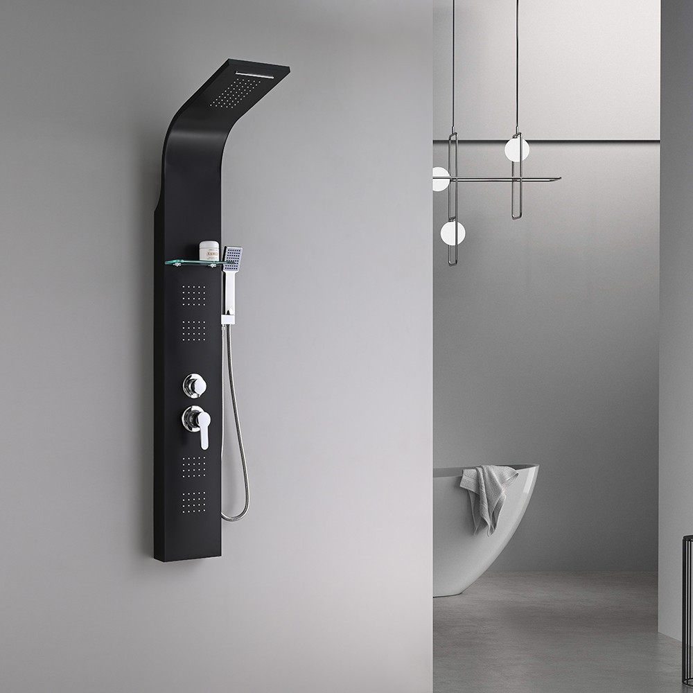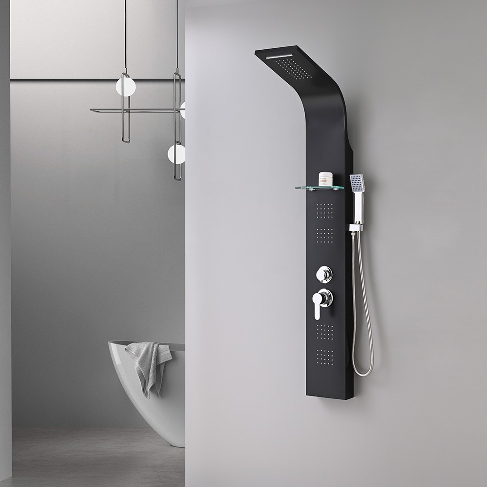 Az Alegro Black hidromasszázs zuhanypanel egy exkluzív, rozsdamentes acélból készült zuhanyrendszer, amely magas színvonalú designnal és számos fejlett funkcióval rendelkezik. Ez a zuhanypanel tökéletes választás lehet, ha egy luxus kivitelű, modern zuhanyzóélményre vágyik. A zuhanypanel egy nagy méretű esőztetővel és vízesés funkcióval van felszerelve, amelyek egyedi és lenyűgöző zuhanyzási élményt nyújtanak. Az esőztető finom vízcseppeket bocsát ki, amelyek lágy és pihentető zuhanyzást tesznek lehetővé, míg a vízesés funkció erőteljes és masszív vízsugarat teremt, amely kellemes relaxációt biztosít.