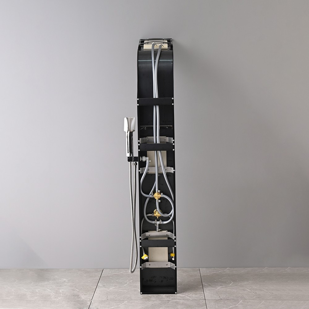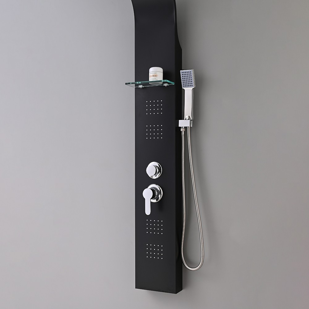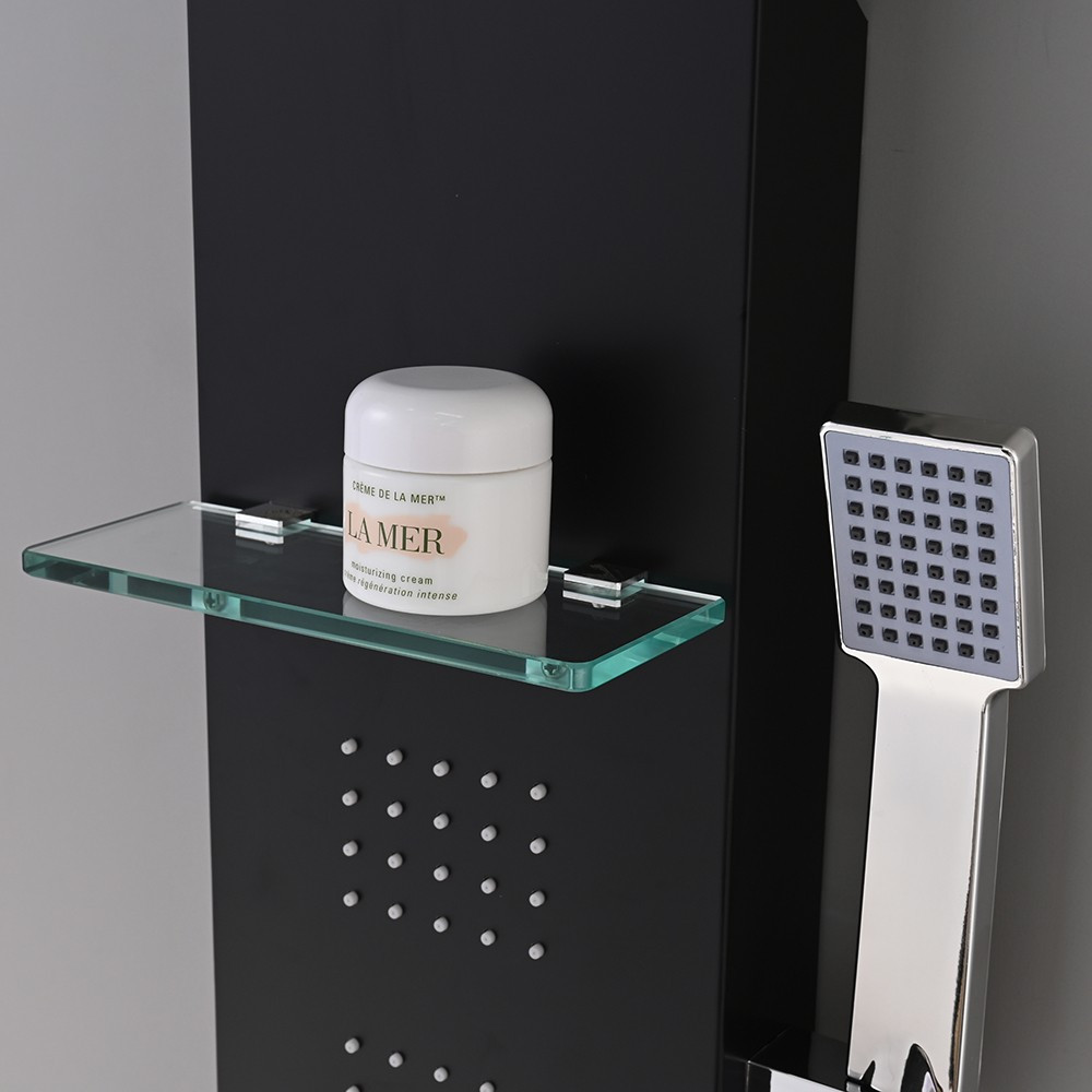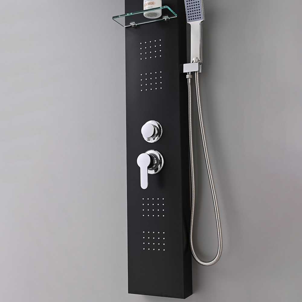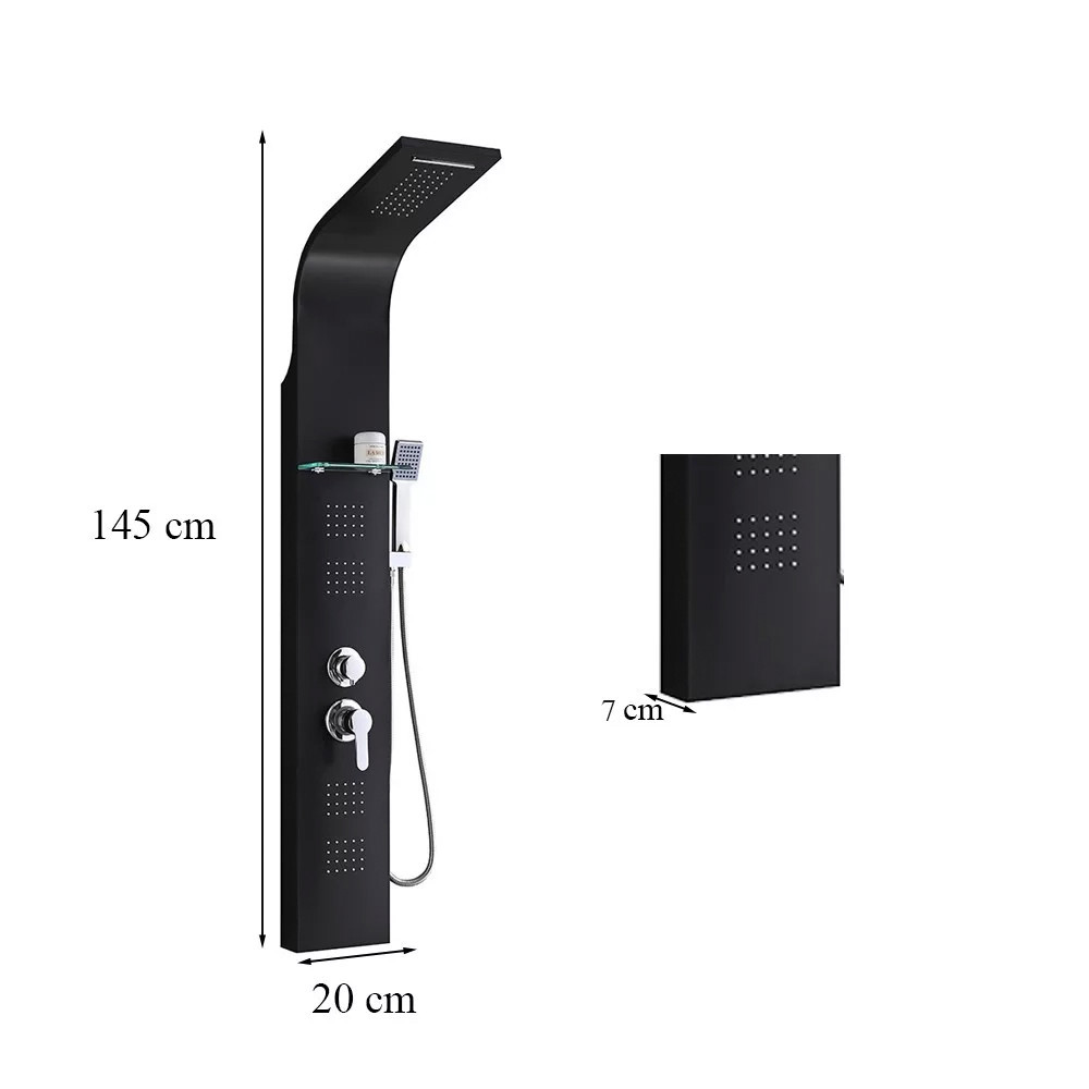 A zuhanypanelhez tartozik egy 150 cm hosszú rozsdamentes acél gégecső, amely lehetővé teszi a zuhanyfej mozgatását és a könnyű használatot. Emellett egy praktikus üvegpolc is megtalálható a panelen, ahol a zuhanyzás közbeni szükséges kozmetikumokat és egyéb tárgyakat elhelyezheti. Az Alegro Black hidromasszázs zuhanypanel magassága 145 cm, szélessége 20 cm és mélysége 7 cm, így egy kompakt és helytakarékos megoldást jelent a fürdőszobájában. A rozsdamentes acél anyagválasztás nemcsak a tartósságot és a hosszú élettartamot garantálja, hanem elegáns és modern megjelenés kölcsönöz.