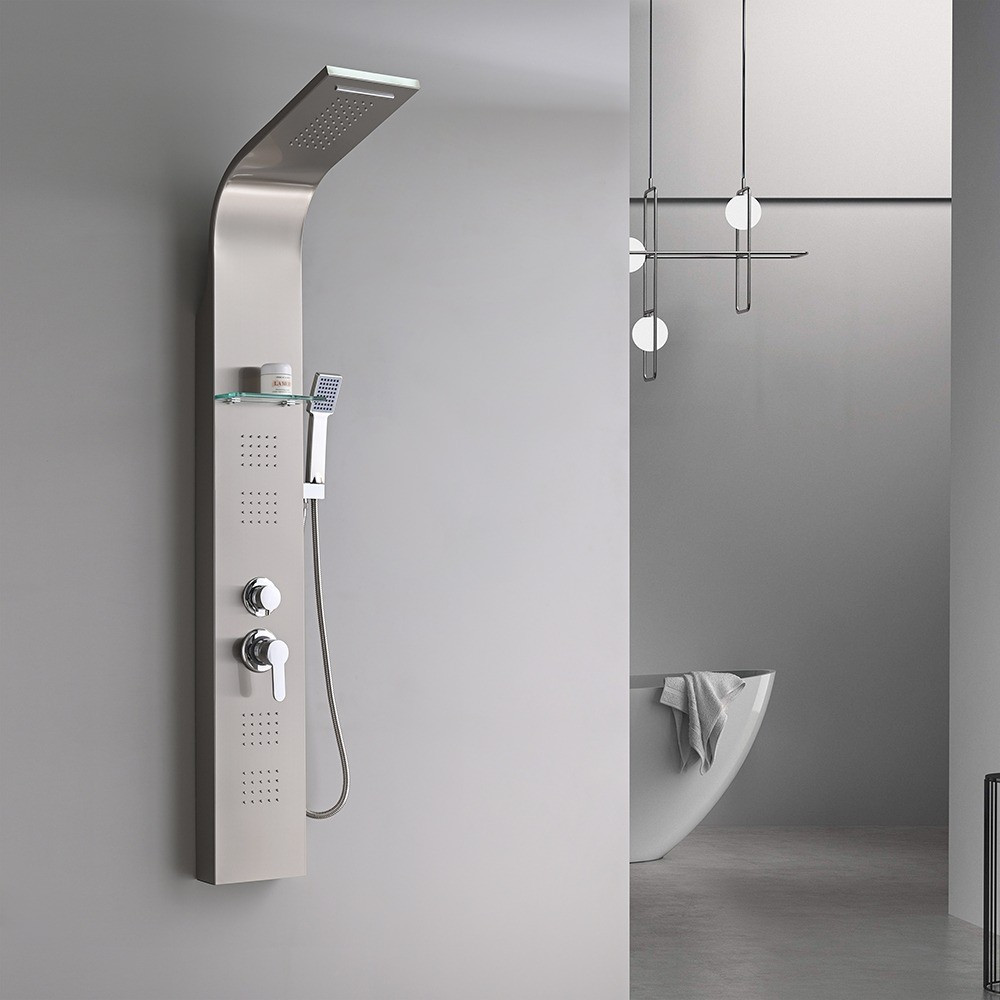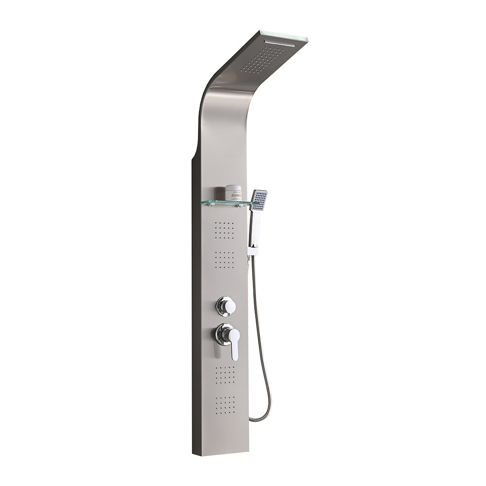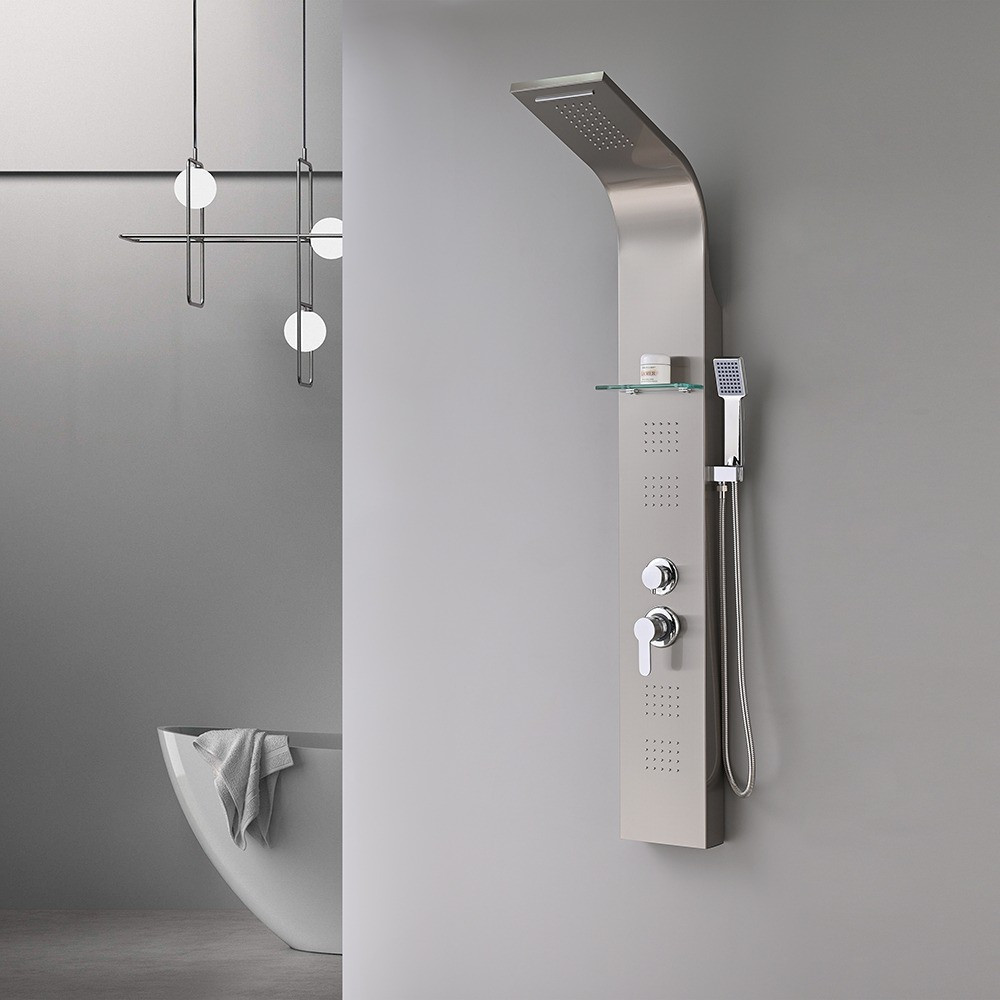 Az Alegro Silver hidromasszázs zuhanypanel egy exkluzív, rozsdamentes acélból készült zuhanyrendszer, amely magas színvonalú designnal és számos fejlett funkcióval rendelkezik. Ez a zuhanypanel tökéletes választás lehet, ha egy luxus kivitelű, modern zuhanyzóélményre vágyik. A zuhanypanel egy nagy méretű esőztetővel és vízesés funkcióval van felszerelve, amelyek egyedi és lenyűgöző zuhanyzási élményt nyújtanak. Az esőztető finom vízcseppeket bocsát ki, amelyek lágy és pihentető zuhanyzást tesznek lehetővé, míg a vízesés funkció erőteljes és masszív vízsugarat teremt, amely kellemes relaxációt biztosít.
