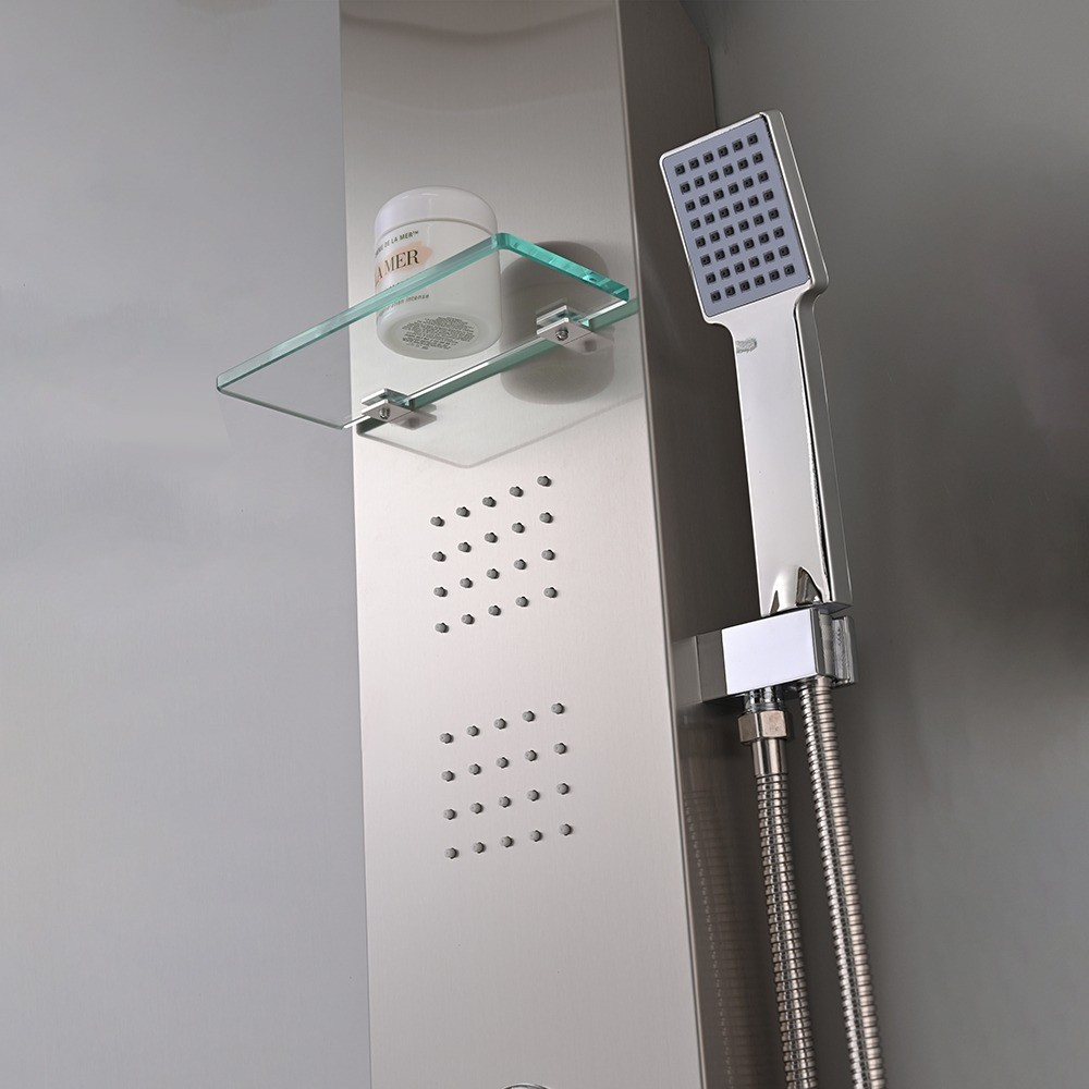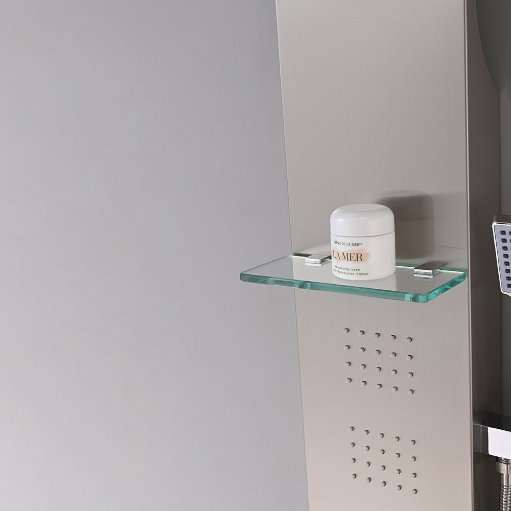 A zuhanypanelhez tartozik egy 150 cm hosszú rozsdamentes acél gégecső, amely lehetővé teszi a zuhanyfej mozgatását és a könnyű használatot. Emellett egy praktikus üvegpolc is megtalálható a panelen, ahol a zuhanyzás közbeni szükséges kozmetikumokat és egyéb tárgyakat elhelyezheti. Az Alegro Silver hidromasszázs zuhanypanel magassága 145 cm, szélessége 20 cm és mélysége 7 cm, így egy kompakt és helytakarékos megoldást jelent a fürdőszobájában. A rozsdamentes acél anyagválasztás nemcsak a tartósságot és a hosszú élettartamot garantálja, hanem elegáns és modern megjelenés kölcsönöz.