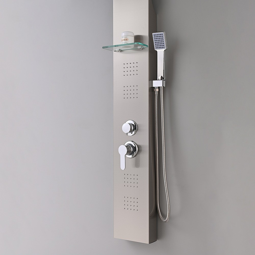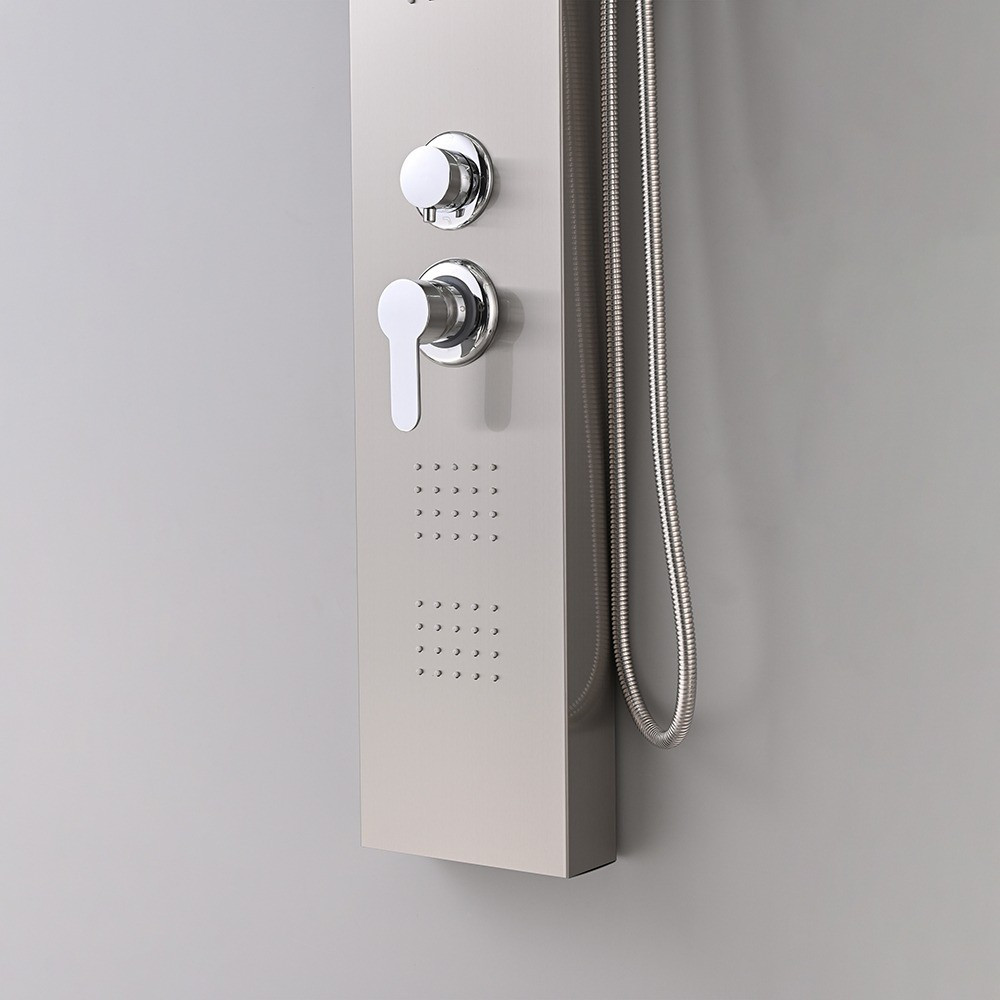 A kerámiabetétes csaptelep gondoskodik a víz hőmérsékletének és áramlásának precíz szabályozásáról. A 4 funkciós krómozott váltószelep lehetővé teszi a különböző vízbeállítások közötti könnyű váltást, így személyre szabhatja a zuhanyzóélményt. Emellett a mechanikus keverő csaptelep lehetővé teszi a víz hőmérsékletének pontos beállítását a kívánt szintre. A zuhanypanelen 4 integrált masszázsfúvóka található, amelyek további relaxációt és élvezetet nyújtanak. Ezek a masszázsfúvókák finom vízsugarakkal stimulálják a testet, segítve a feszültség és a stressz oldását. A krómozott kézi zuhannyal pedig könnyedén irányíthatja a vízsugarat és célozhatja az adott területet.
