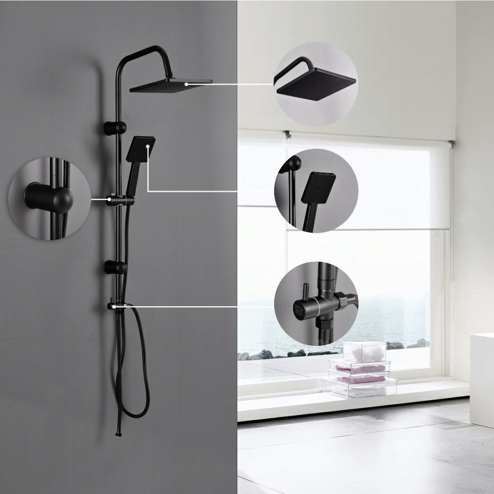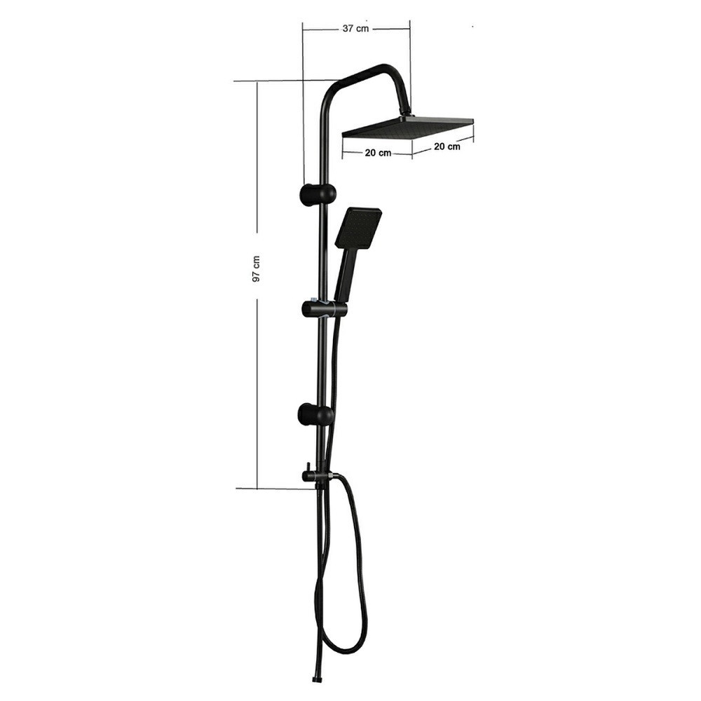 Az Altar Black zuhanyszett tartalmaz két állású funkcióváltót az ABS fekete kézizuhany és az 1,20 cm-es felső esőztető közötti váltás érdekében. A zuhanyszett teste rozsdamentes acélból készül, mely festett fekete színű. A két tartókonzol magassága állítható. A kézizuhany 1,5 m-es zuhanytömlővel rendelkezik.A zuhanyszettet a talajtól 85 cm-re ajánlott felszerelni.