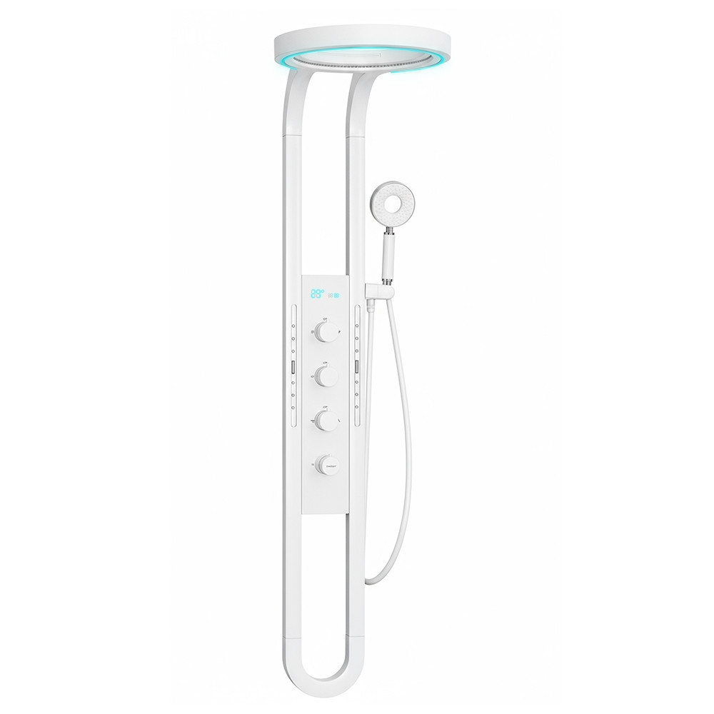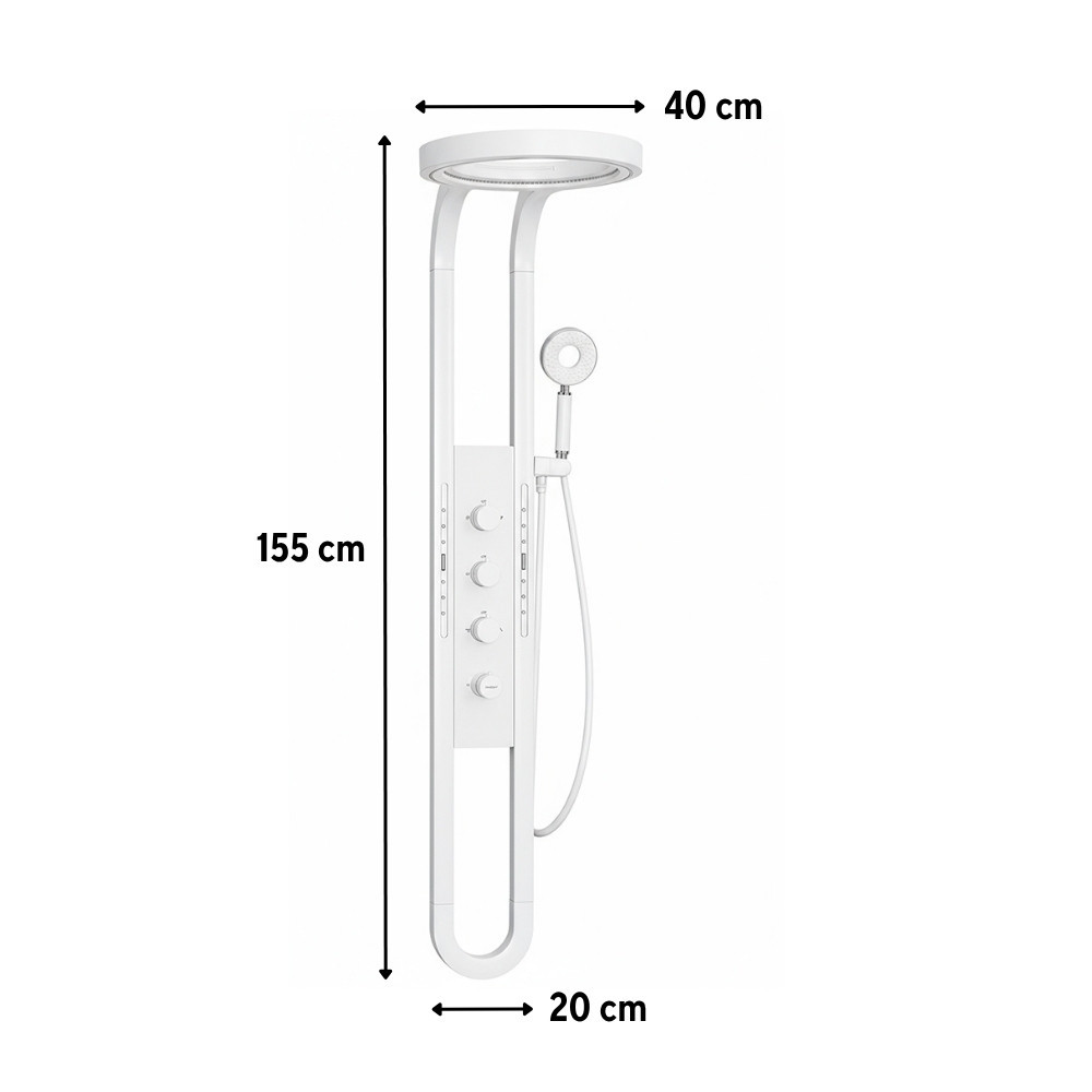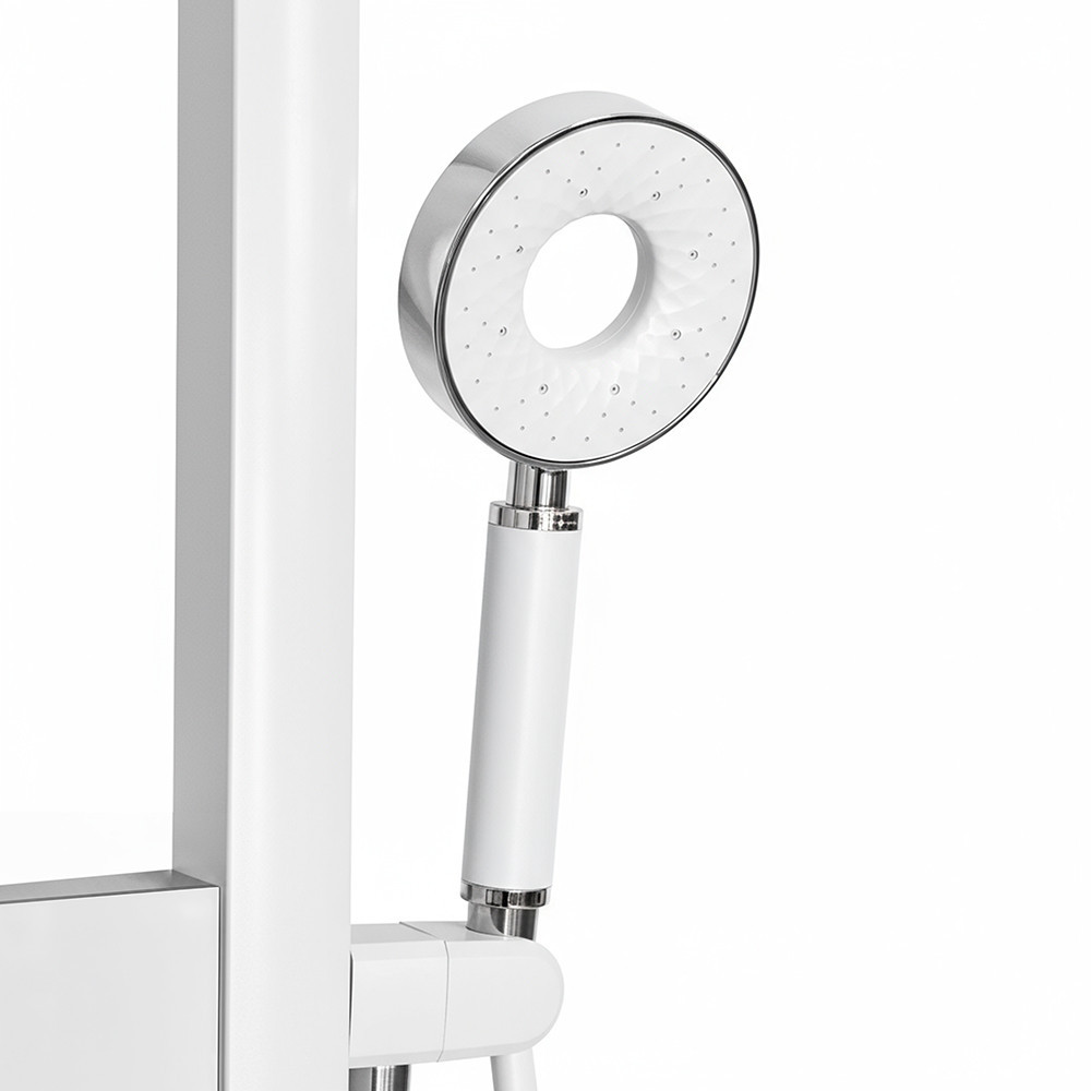 A zuhanypanel rozsdamentes acélból készült, amely garantálja a hosszú élettartamot és a prémium megjelenést. A fehér szín modern eleganciát sugároz, amely bármely fürdőszobai környezethez illeszkedik.