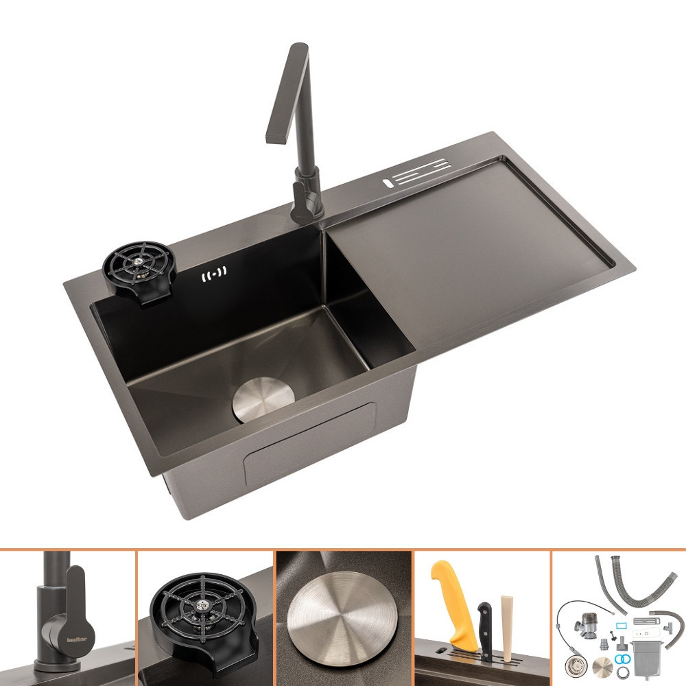 A Leziter Avena II rozsdamentes mosogató nemcsak egy látványos dizájnelem, hanem egy átgondolt, komplett konyhai megoldás is. A csomag része a Valen csaptelep, valamint egy praktikus pohármosó, így az első perctől kezdve maximális funkcionalitást biztosít.