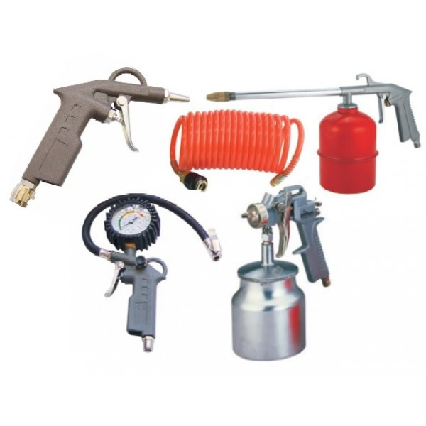 Tartalma: 1 db alsótartályos festékszóró, 1 db tömlőfúvató, 1 db spiráltömlő gyorscsatlakozóval, 1 db lefúvató pisztoly, 1 db olajszóró pisztoly.