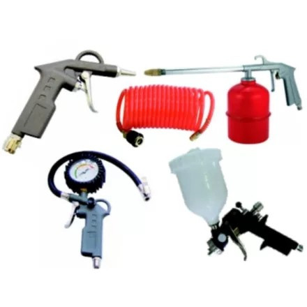 Szervizkészlet ház körüli és barkács célokra.A készlet tartalma:1 db felsőtartályos festékszóró (0,6 literes tartállyal)1 db pneumatikus tömlőfúvató1 db spiráltömlő gyorscsatlakozóval (munkahossz 5 méter, átmérő 8x6 mm)1 db rövid csövű lefúvató pisztoly1 db olajszóró pisztoly