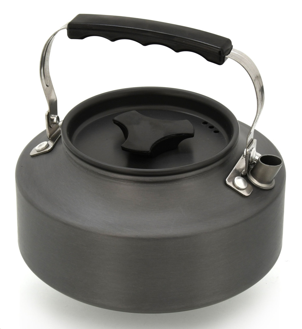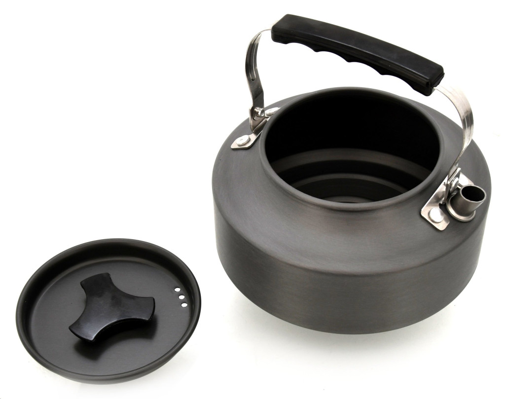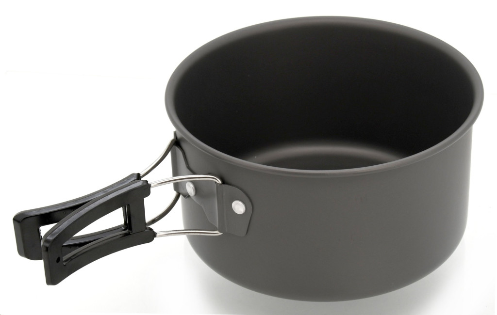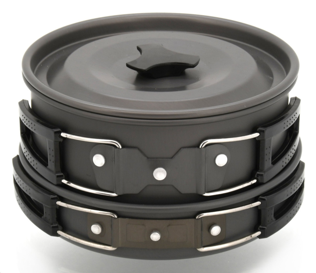 Ez az eloxált alumníniumból készült készlet 18 x 4 cm-es serpenyőt, 17 x 9 cm-es fazekat, 15 x 7,5 cm teáskannát és 17 cm átmérőjű fedelet tartalmaz. A különböző méreteknek köszönhetően az edényeket egymásba lehet rakni. A kényelmes kezelés érdekében a fazekak lehajtható fogantyúkkal vannak ellátva, szilikonos védőkkel. Minden egy praktikus hálós táskában van elhelyezve, tehát a készlet áthelyezése nagyon egyszerű.