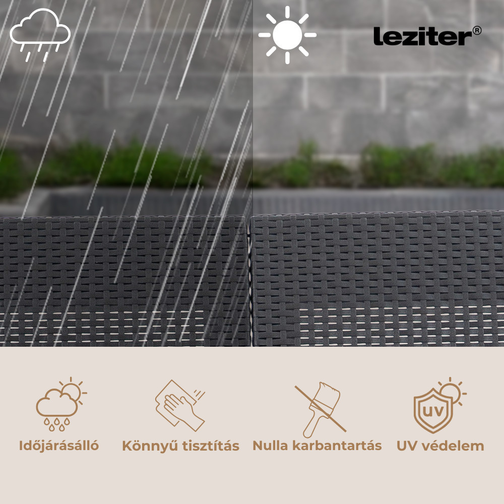 A grafit színben kapható kerti bútor szett könnyű, egyben tartós vázszerkezettel büszkélkedik. Mindennek tetejében roppantul könnyen tisztítható minden egyes eleme, így pillanatok alatt makulátlanná varázsolható az összkép. A grafit árnyalatban elérhető szetthez szürke párnák társulnak, melyek a maximális kényelmet hivatottak borítékolni, a divatos és szemre való megjelenés mellett. A bútorok erős és tartós műanyagból készültek. Az erős, tartós kialakítás nagyfokú megbízhatóságot jelent a gyakorlatban és azt, hogy a bútordarabok kivétel nélkül hosszú élettartamot biztosítanak, az örömteli, nyári napokat fűszerező használaton kívül, ami a fenti pozitívumoknak hála alap.