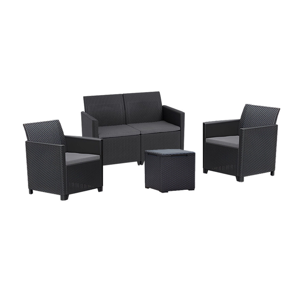 Ez a Grafit színű rattan hatású kerti bútor szett két fotellel, egy 4 személyes sarokkanapéval és egy tárolós asztallal rendelkezik, amelyeket időjárásálló műanyagból készítettek, így nem kell aggódnod a UV sugárzás hatásaitól sem. A fotel magassága: 74 cm, szélessége: 63 cm, hossza: 65 cm. A fotel és a kanapé párnával rendelkezik, mely kényelmessé teszi és színben passzol a bútorhoz. Az asztal magassága: 37 cm, szélessége: 37 cm, hossza: 37. Az asztal több funkciós, így a tároló részében elrejtheted a kerti eszközöket.