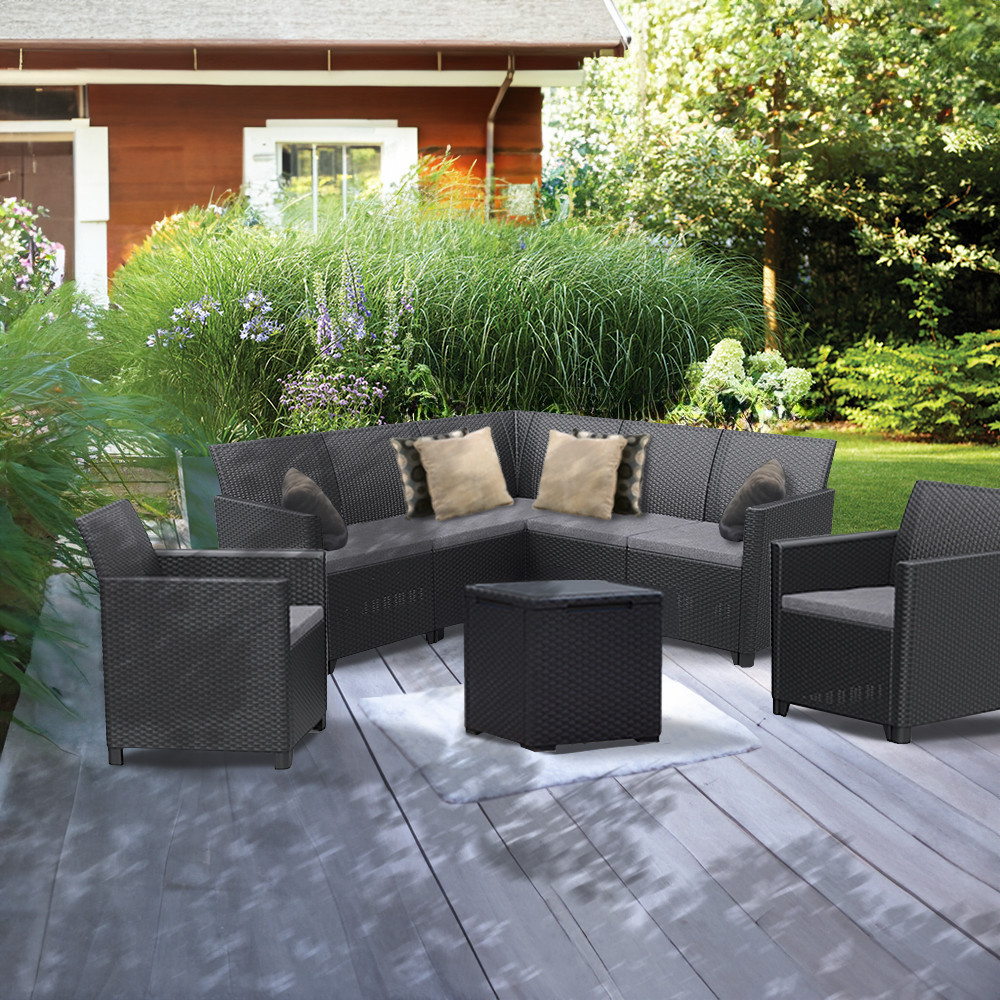 Ez a Grafit színű rattan hatású kerti bútor szett két fotellel, egy 4 személyes sarokkanapéval, egy 2 fotlellel és egy tárolós asztallal rendelkezik, amelyeket időjárásálló műanyagból készítettek, így nem kell aggódnod a UV sugárzás hatásaitól sem. A fotel magassága: 74 cm, szélessége: 63 cm, hossza: 65 cm. A kanapé párnával rendelkezik, mely kényelmessé teszi és színben passzol a bútorhoz. Az asztal magassága: 37 cm, szélessége: 37 cm, hossza: 37. Az asztal több funkciós, így a tároló részében elrejtheted a kerti eszközöket.