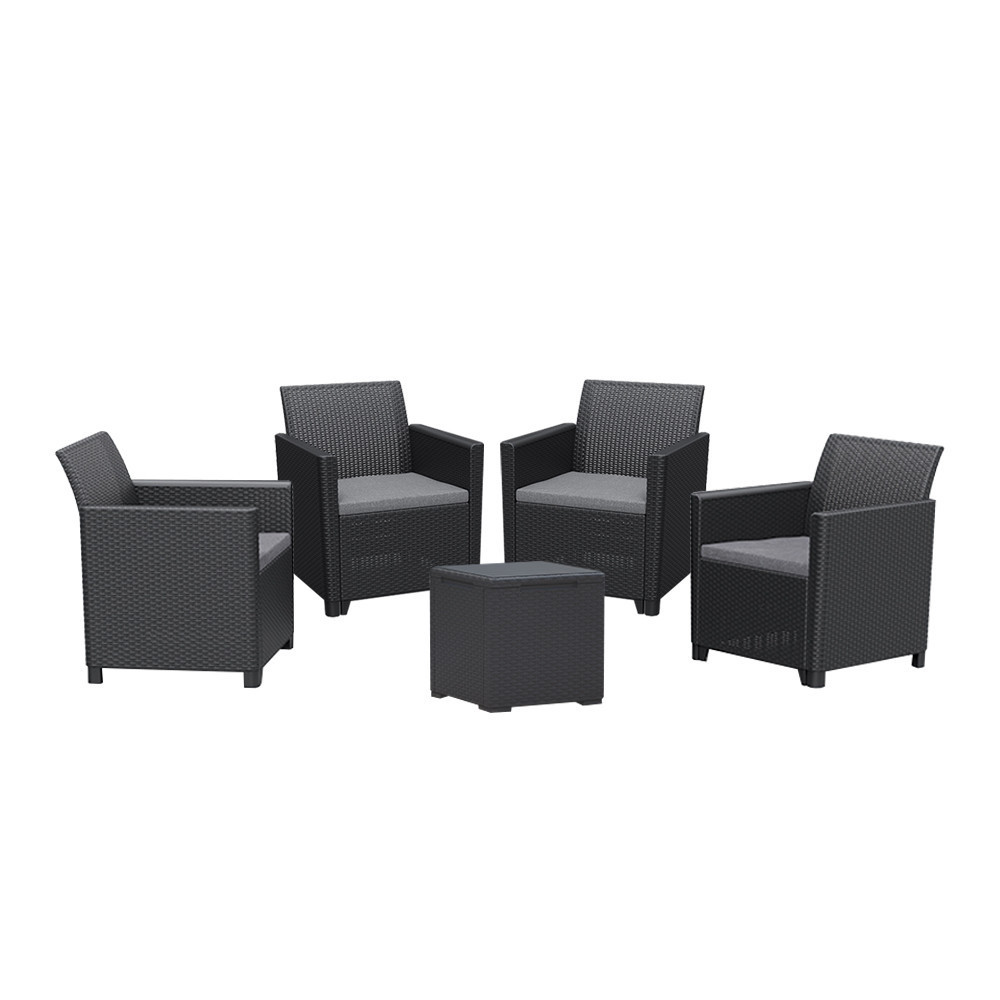 Ez a Grafit színű rattan hatású kerti bútor szett négy fotellel, és egy tárolós asztallal rendelkezik, amelyeket időjárásálló műanyagból készítettek, így nem kell aggódnod a UV sugárzás hatásaitól sem. A fotel magassága: 74 cm, szélessége: 63 cm, hossza: 65 cm. A fotel és a kanapé párnával rendelkezik, mely kényelmessé teszi és színben passzol a bútorhoz. Az asztal magassága: 37 cm, szélessége: 37 cm, hossza: 37. Az asztal több funkciós, így a tároló részében elrejtheted a kerti eszközöket.