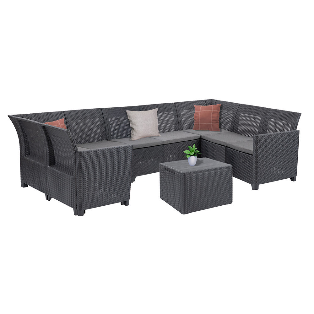 A kompakt és letisztult megjelenésű sarokgarnitúra kiváló választás akár kisebb teraszokra is. Modern formatervezése illeszkedik a legtöbb kültéri enteriőrhöz, így esztétikai élményt is nyújt.
