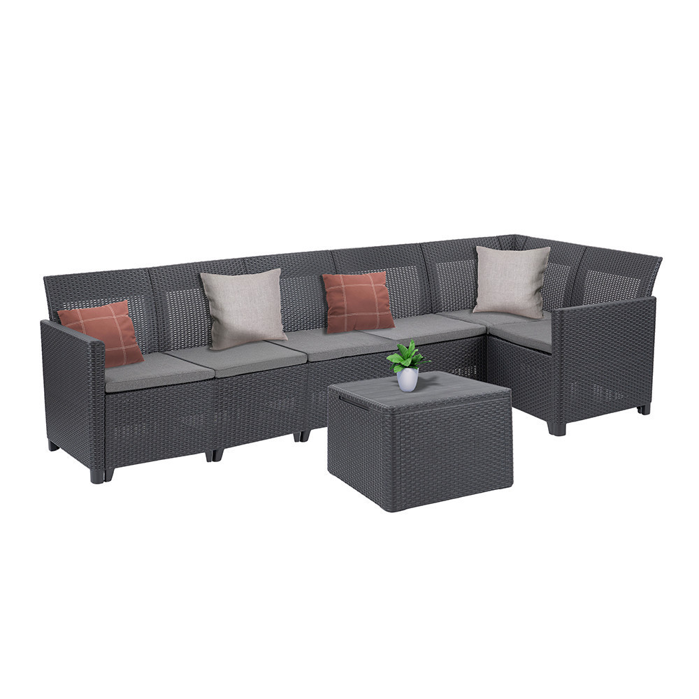 A CLAIRE VIII 6 személyes sarokgarnitúra ideális választás, ha ki szeretnéd használni teraszod vagy kerted minden szegletét. Ez a prémium minőségű bútorszett egyesíti a funkcionalitást és a modern designt, lehetővé téve, hogy a család és barátok kényelmesen élvezhessék a közös időtöltést a szabadban.
