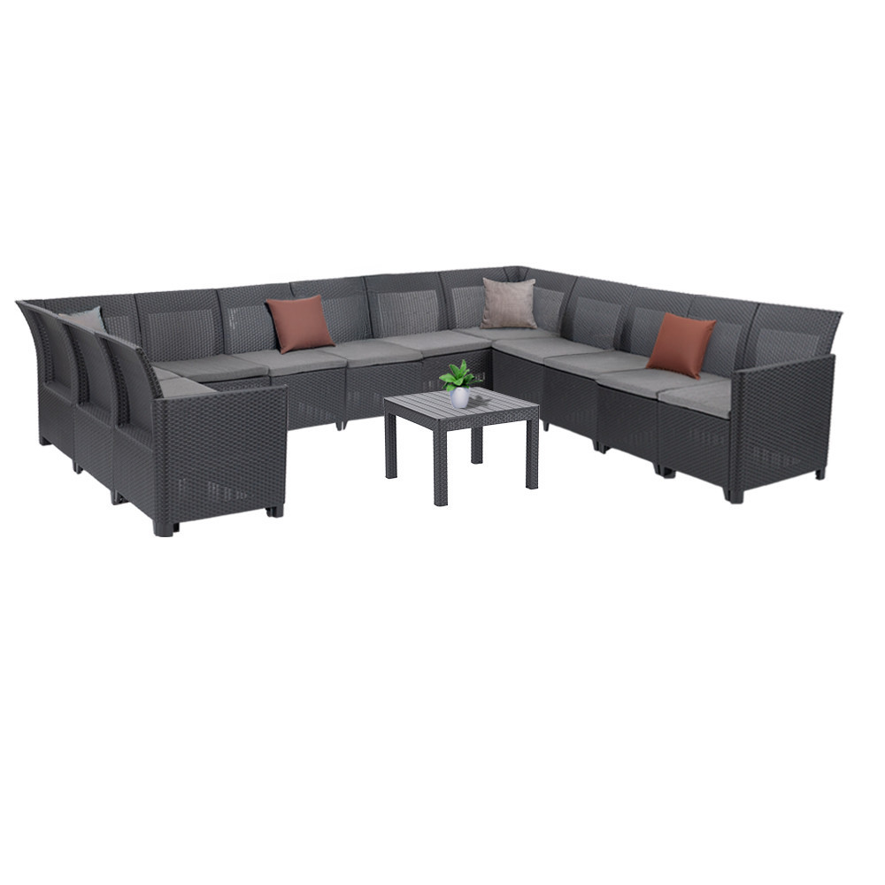 A garnitúra strapabíró, újrahasznosított műanyagból készül, amit úgy formáztak, hogy rattan hatású legyen, így hozva létre a stílus és a tartósság egyensúlyát. A párnák és a váz könnyen illeszthető, bővíthető rendszerben működnek – így biztosítva a teljes szabadságot és hosszú élettartamot.