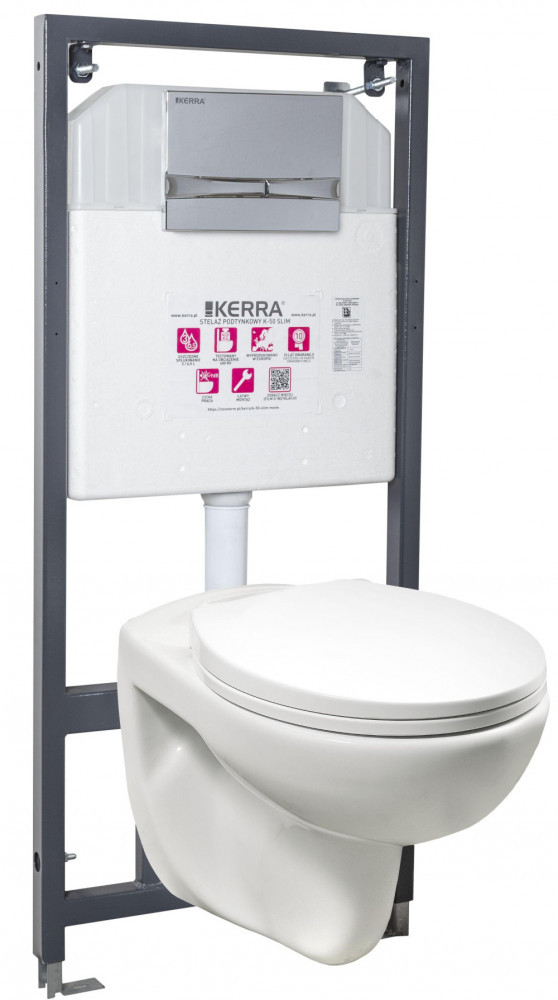 A készlet tartalma: 1 db rejtett rögzítőkeret tartállyal, 1 db Doris WC-csésze, 1 db Doris wc ülőke (polipropilén, soft-close), 1 db dupla nyomólap (króm)