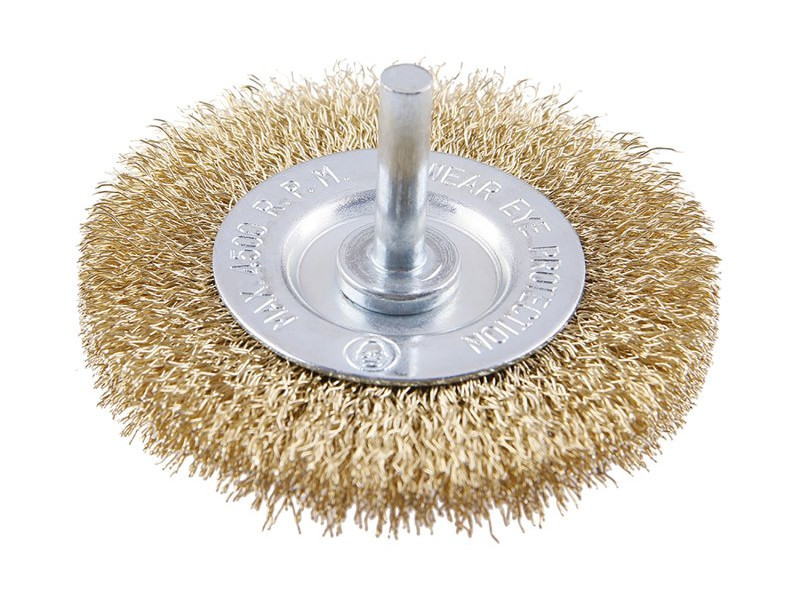 Rotary brush - circular, design: corrugated wire 0.25 mm - brass-plated, diameter 75 mm, shank 6 x 27 mm, galvanized brush body, number of wires: 1728, wire length: 16 mm, max. permissible revolutions: 4500 1/min, use : for polishing, roughening, removal of rust and burrs, packaging: blister with euro hole.