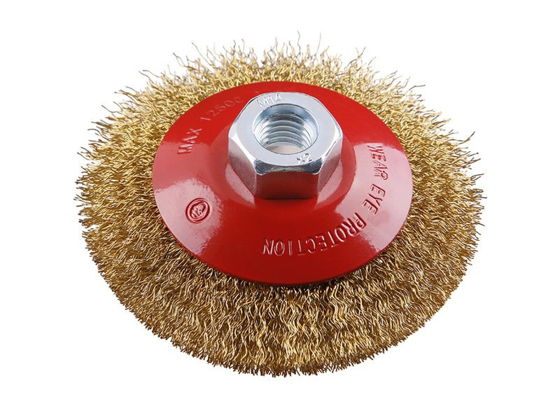 Rotary brush - cup, FESTA brush guarantees high-quality materials and workmanship, corrugated wire - brass-plated 0.3mm, diameter 100mm, attachment M14*2, number of wires 1800, wire length 19mm, maximum revolutions per min. 12500, use: for removing rust, paint, polishing..., packaging: paper box with euro hole.
