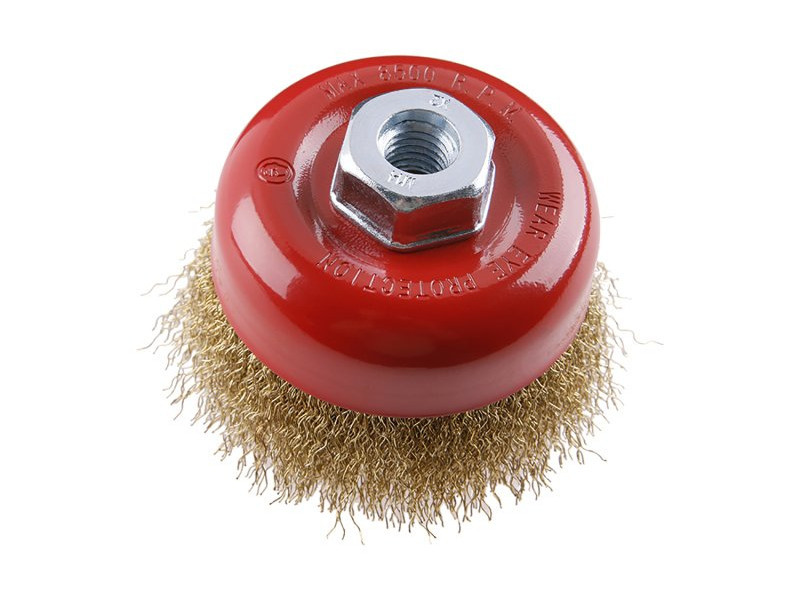 Rotary brush - cup, FESTA brushes guarantee quality used materials and processing, corrugated wire - brass-plated 0.3mm, diameter 100mm, number of wires 2500, wire length 26mm, maximum revolutions per min. 8500, mounting M14*2mm, maximum revolutions per min. 12500, suitable for removing rust, paint, polishing..., packaging: paper box with euro hole.