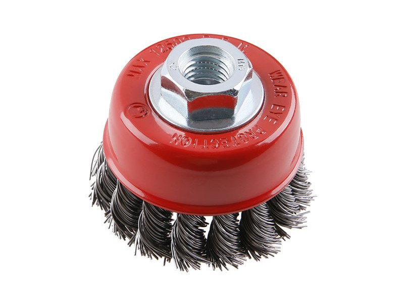 Rotary brush - cup, design: COPY - patented wire 0.5 mm = copies do not unravel even under extreme load, FESTA brushes guarantee high-quality materials used and processing, diameter 65 mm, attachment M14*2 mm, number of wires 720, wire length 17 mm, maximum revolutions per min. 12500, use: for locksmith and metalworking work, removing rust, paint, cleaning welds..., packaging: paper box with euro hole.