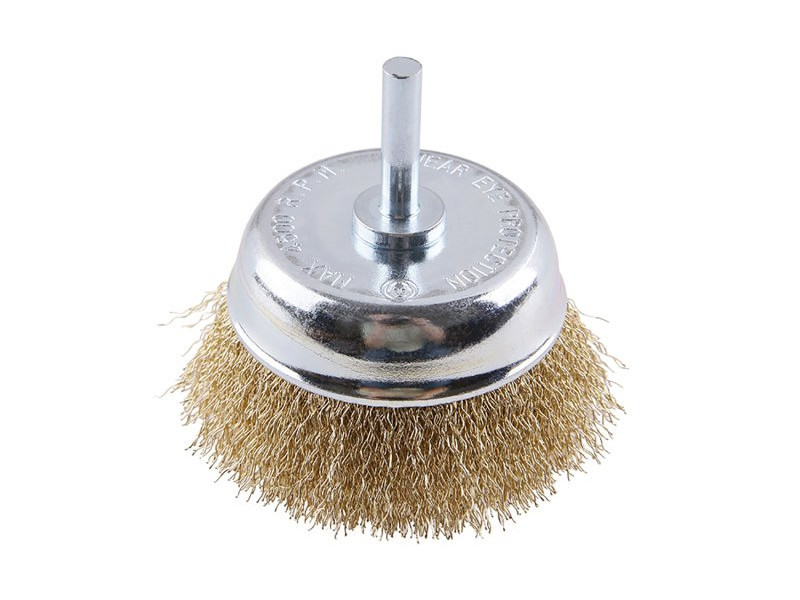 Rotary brush - cup, design: corrugated wire 0.25 mm - brass-plated, diameter 68 mm, shank 6 x 27 mm, galvanized brush body, number of wires: 1728, wire length: 19 mm, max. permissible revolutions: 4500 1/min , use: for polishing, roughening, removing rust and burrs