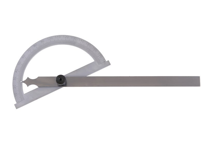 Protractor with swivel arm, angle base length 150mm, swivel arm length 200mm, 0 - 180°, possibility of locking the measured angle for transfer. Stainless steel, leather case.