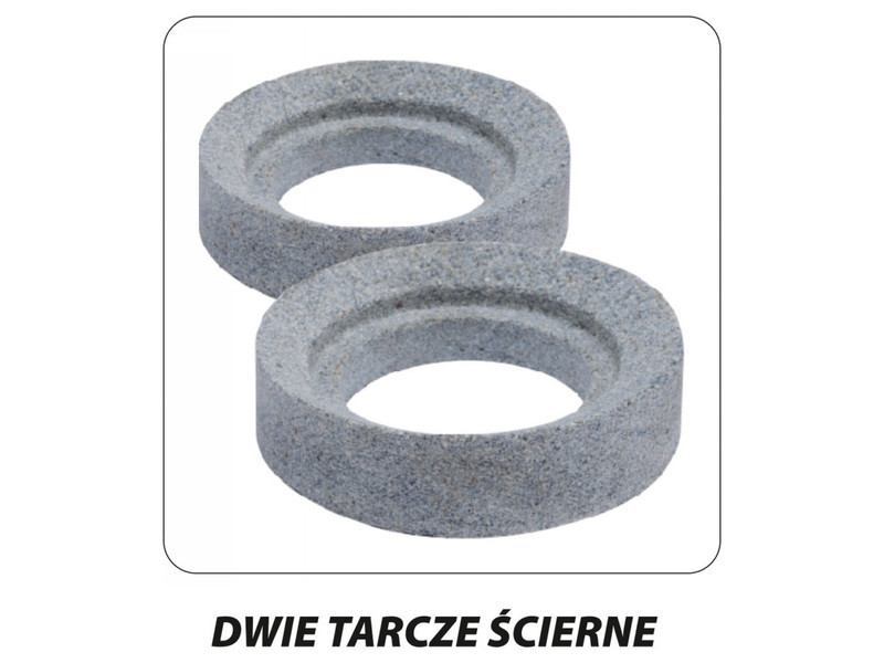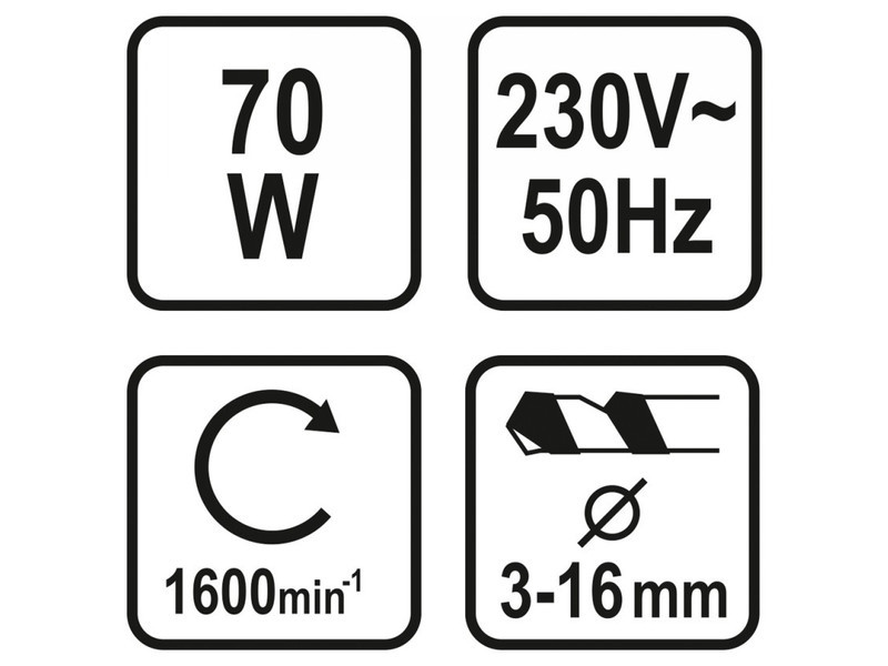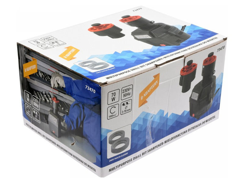 Fúróhegy élező 3-16mm 70W, 2 fejjel és koronggalFúróhegy élező acélból készült. Az élező két munkafejjel rendelkezik, amelyek lehetővé teszik a különböző átmérőjű fúrók élezését. Az eszköz időszakos működésre van tervezve. Csiszolókorong átmérője: 58 mm; 70 mm Fúróhegy szöge: 118 fok Fúrószár átmérője: 3 mm - 10 mm (58 mm lemez) 8 mm - 16 mm (70 mm lemez) Alkalmazási terület Az élezőt tompa fúrószárak élezésére használják. Lehetőség van fémfúrók vagy univerzális fúrók élezésére. Az élező nem alkalmas kerámia anyagból készült pengéjű fúrók, fafúrók, szárnyas fúrók, csigafúrók, koronafúrók és a acél- vagy univerzális fúróktól eltérő formájú pengéjű fúrók élezésére. A csomag tartalma: élező 2 fej 2 korong Műszaki adatok teljesítmény [W]: 70 fordulatszám [1/perc]: 1600 átmérő [mm]: 3-16 .