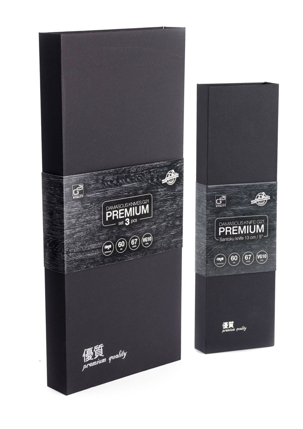 A damaszkuszi acél pengéjű G21 konyhai kések porkohászati technológiával készülnek, ahol az alapfémre (jelen esetben VG-10 acélra) rétegeket visznek fel, amelyek fokozatosan szinterelik össze. Ezeknek a rétegeknek az eltérő összetétele eltérő színezést okoz.