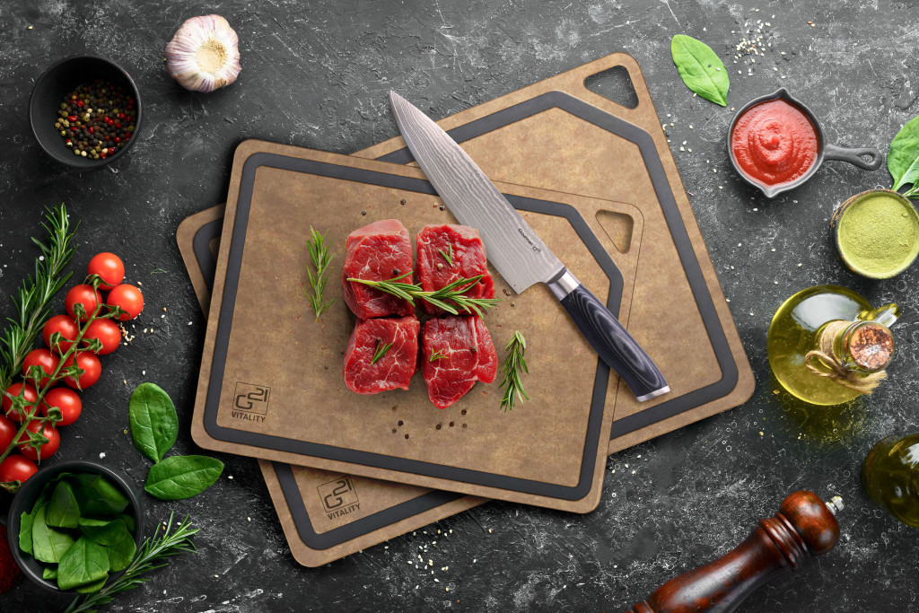 Az biológiailag lebomló cellulózból készült univerzális EcoCut deszkák tartósságot, késekhez való kíméletet és modern megjelenést kínálnak. A hőállóságnak köszönhetően akár edényalátétként is használhatók forró edényekhez. A csúszásmentes felület biztosítja, hogy a deszka munka közben a helyén maradjon, míg a perem menti vájat felfogja a húslevet vagy más folyadékokat – így a konyhapult mindig tiszta marad. A csomag 2 méretű deszkát tartalmaz (30 × 23,5 cm és 37 × 27,4 cm), amelyek ideálisak hús, zöldség, gyümölcs és fűszernövény előkészítéséhez.