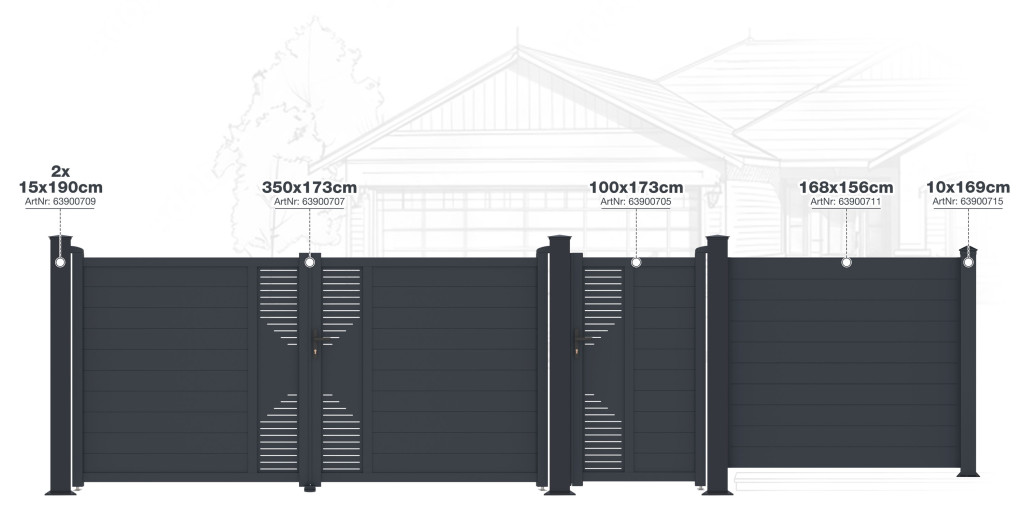 A bejárati kapu kulcsfontosságú része az ingatlan vagy telek kerítésének. A 173 cm magas Marion alumínium kapu a porbevonatnak köszönhetően még hosszabb élettartamú, strapabíró és egyben lenyűgöző és a szélességét a meglévő kerítéshez igazíthatja. Fogantyúnyitás és zár FAB betéttel.