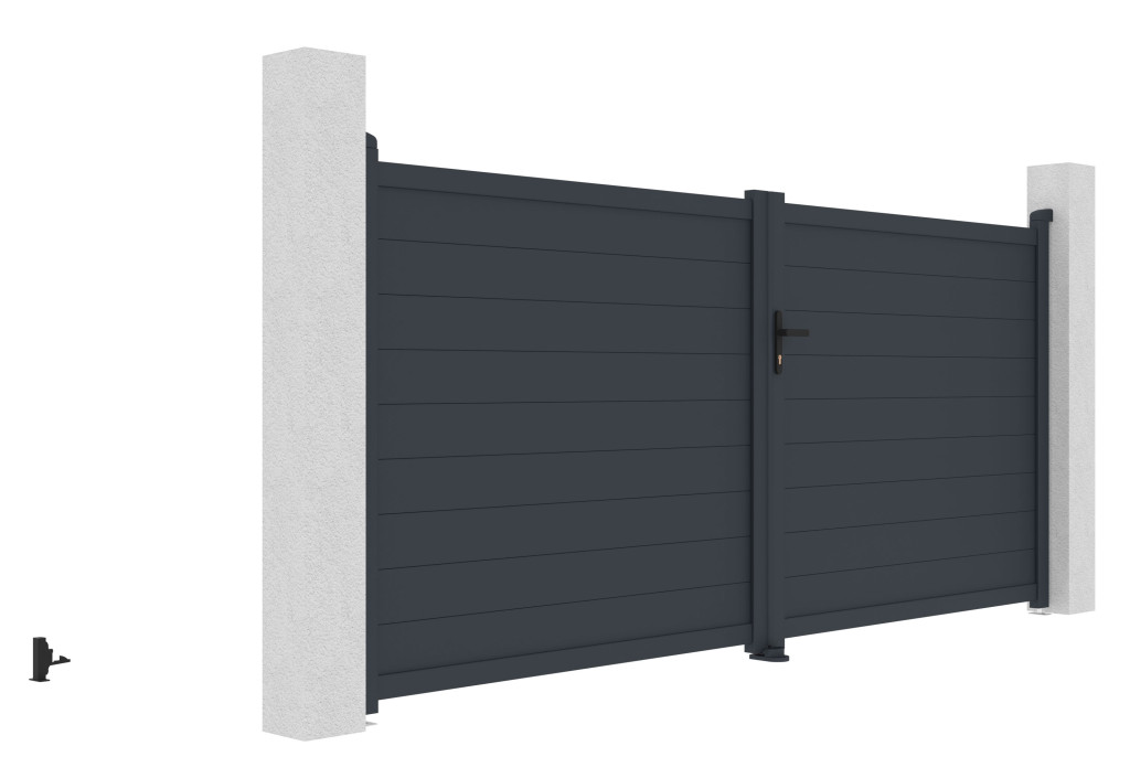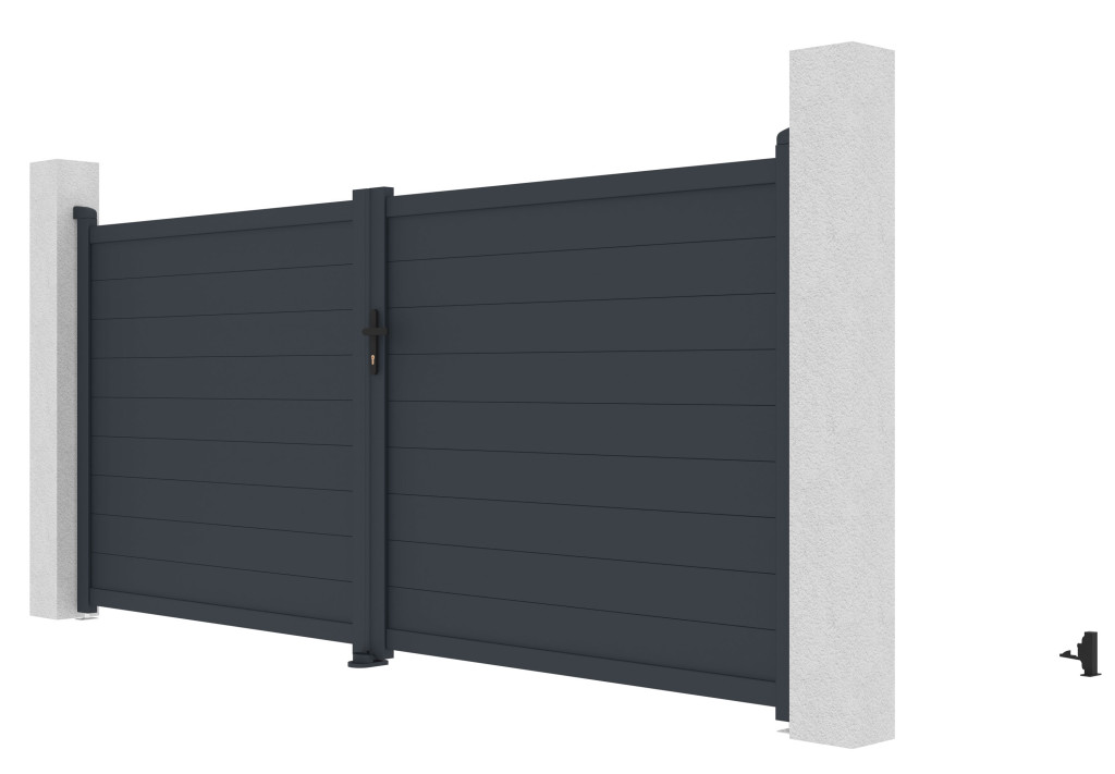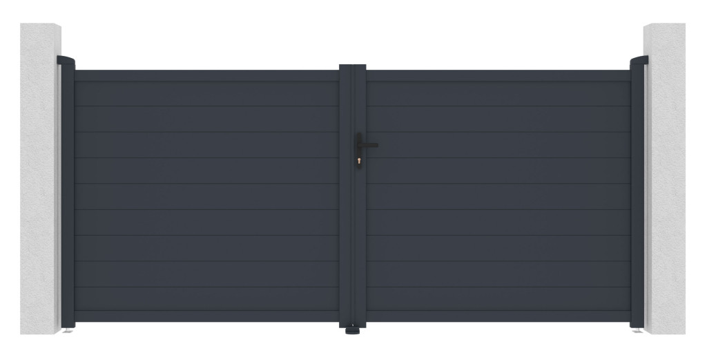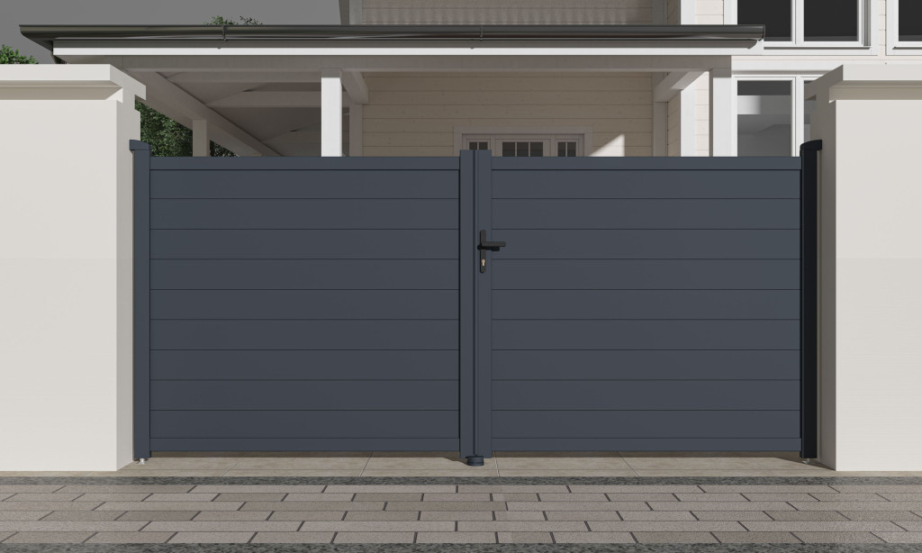A vízszintesen elhelyezett lamellás kitöltés modern antracit megjelenéssel diszkrét és esztétikus megoldást kínál minden típusú kerítéshez. A beépített belső nyitás minden épülettípushoz illeszkedik.