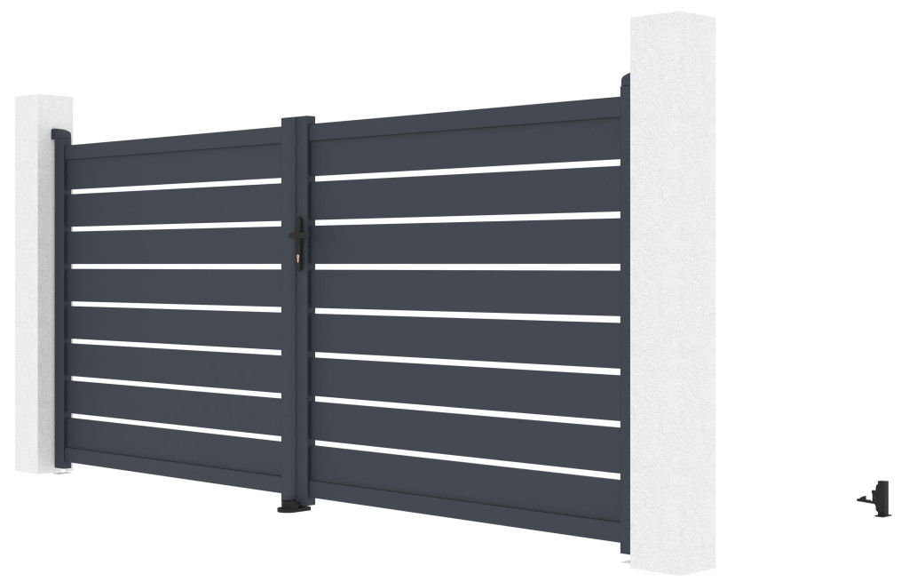 A bejárati kapu fontos része a kerítésnek. A Reno alumínium kapu 158 cm magas, porfestett felülete hosszabb élettartamot biztosít, ellenálló, esztétikus, és szélessége az aktuális kerítéshez igazítható. Kilinccsel és FAB betétes zárral nyitható, 350 cm-es szélessége zökkenőmentes áthaladást tesz lehetővé minden jármű számára.