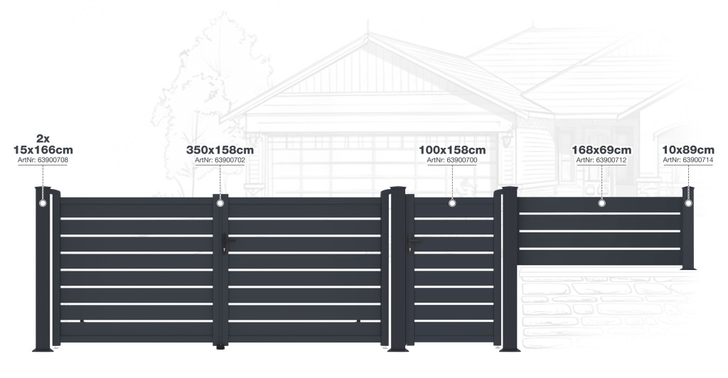 A G21 Reno vagy Marion kerítéselemek minden része – kapuk, bejárati kapuk, kerítéspanelek – így méretre szabható.