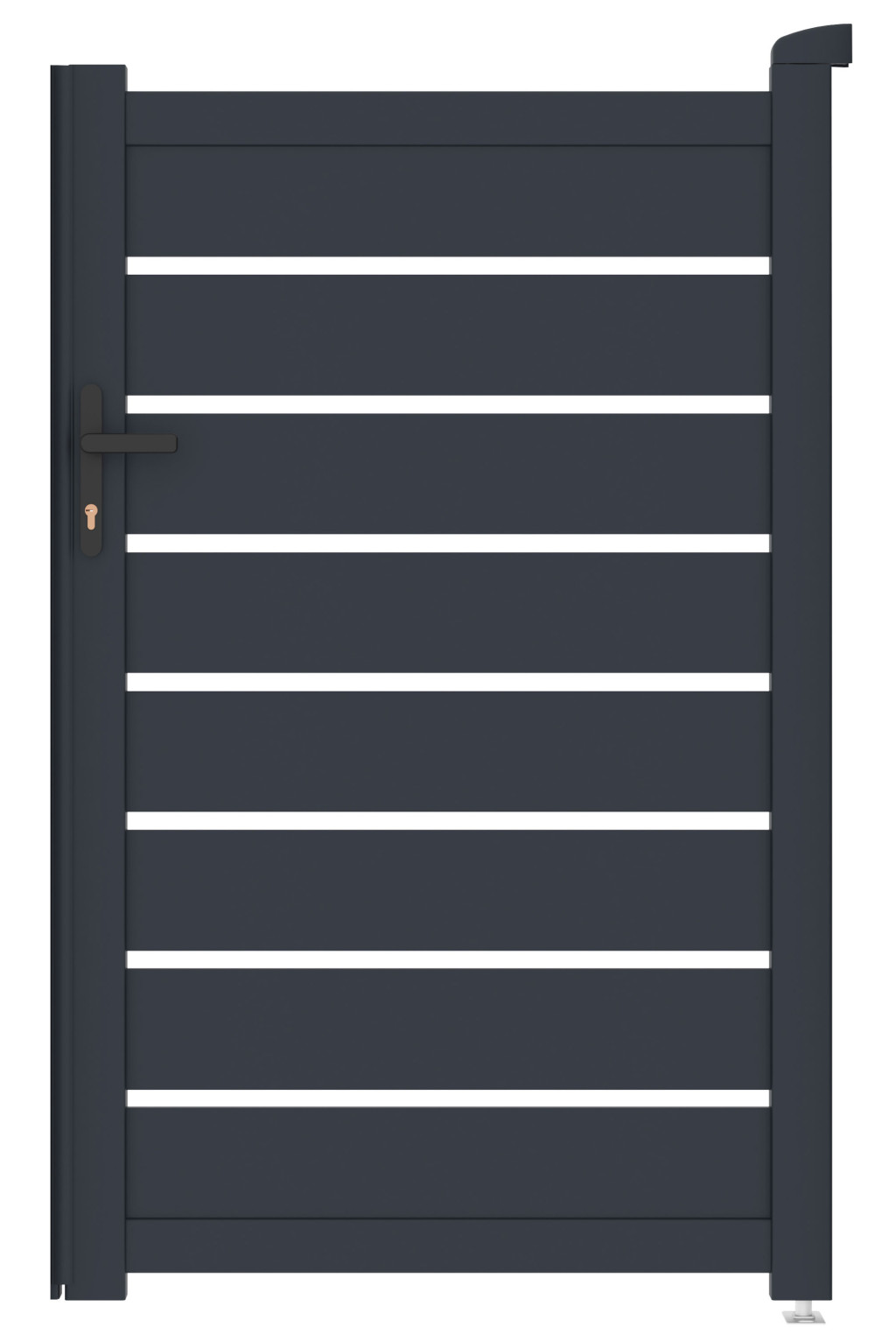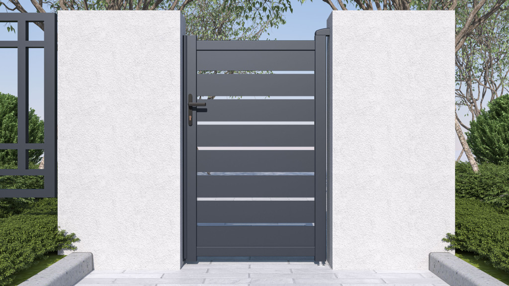 A vízszintesen elhelyezett, tetszetős grafitlécekkel ellátott betét a kellő magánéletet a modern dizájnnal ötvözi, így a befelé nyíló kapu bármilyen típusú bekerített szerkezethez illeszkedik.