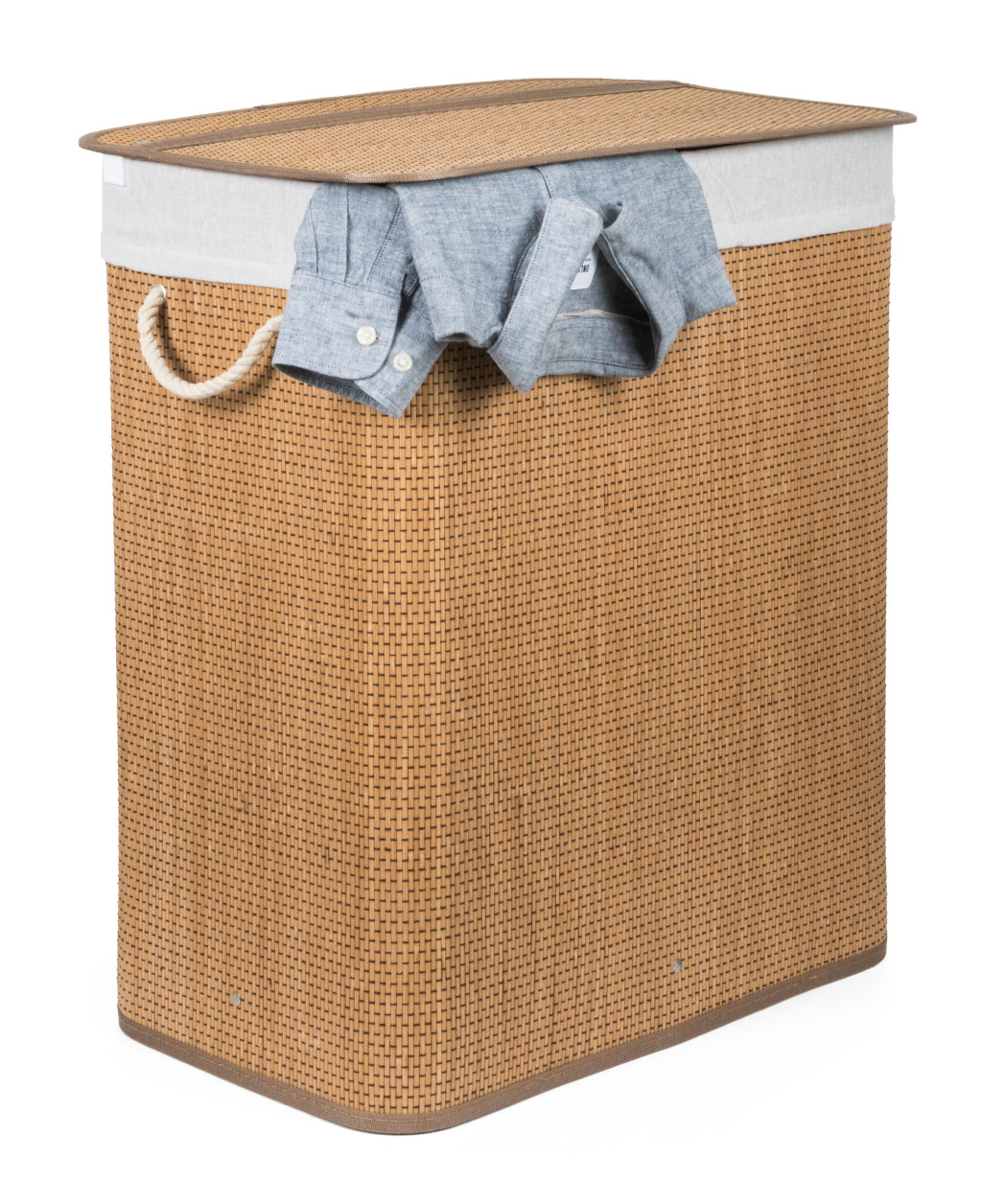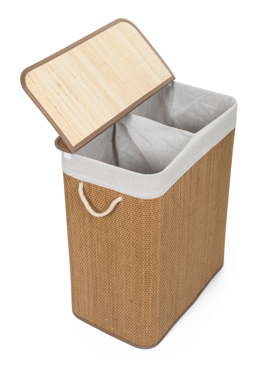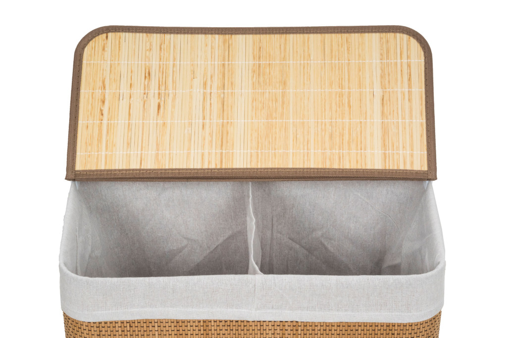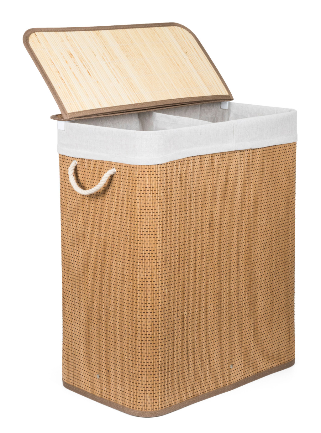 A G21 bambuszkosár , rögzített fedelű és mosható szövetbetéttel rendelkezik, két külön rekeszre osztva. Így mosás előtt szét válogathatja a piszkos ruhaneműt, és különálló darabokat helyezhet el anyagtól vagy színtől függően a kosárba .