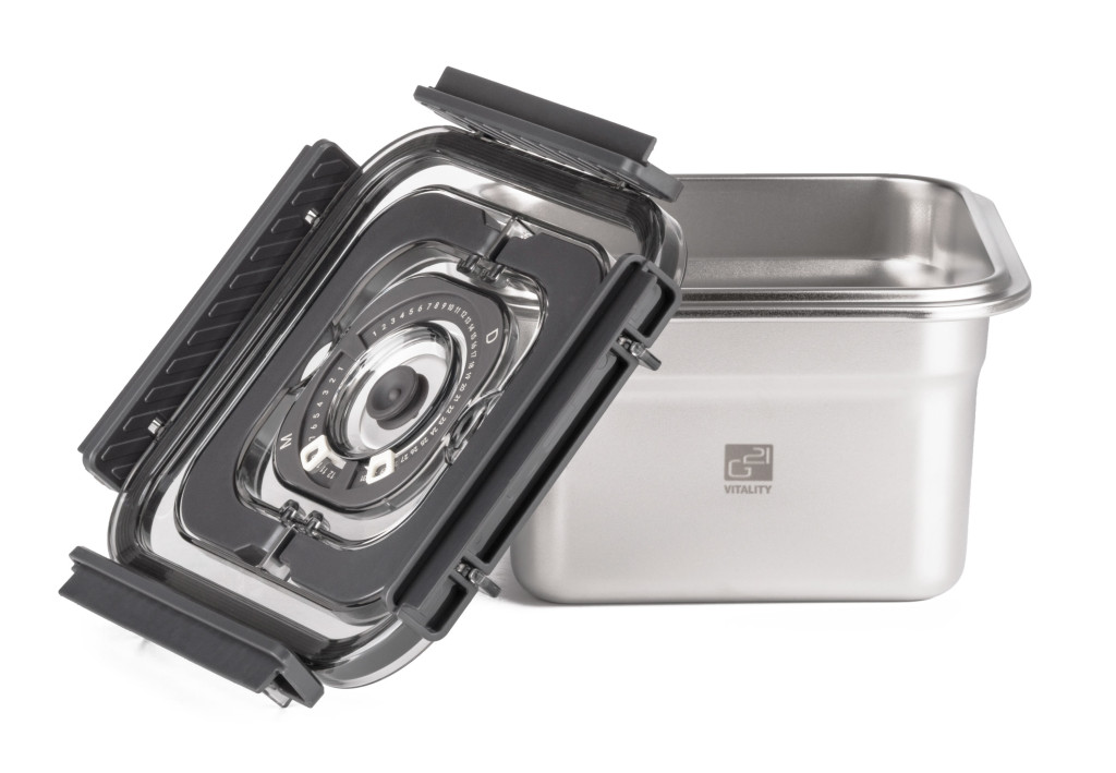A BPA-mentes műanyagból készült fedél vákuumszeleppel és állítható dátumjelzővel van ellátva. Így mindig tudni fogja, mikor lett az étel vákuumozva, vagy meddig fogyasztható. A vákuum kiengedéséhez és a doboz kinyitásához elegendő finoman megnyomni a fedél közepén lévő szelepet.