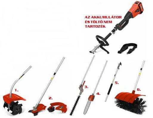 Hecht 1441 Li-ion akkumulátoros többfunkciós multigép, amelyhez további opcionális kiegészítő vásárolható. Óriási előnye az akkumulátoros működés, amely által könnyen kezelhető (nincs kábel), továbbá a csendesebb működés. Az alapkészülékhez a következő opcionális tartozékok választhatóak: HECHT00144163 Kultivátor HECHT00144160 Fűkasza HECHT00144162 Sövényvágó HECHT00144161 Magassági ágvágó HECHT00144166 Hosszabbító szár HECHT00144165 Seprőgép Az akkumulátor és a töltő nem tartozék! Töltő: HECHT005046 Akkumulátor: HECHT005040B és/vagy HECHT005025B ACCU 540 program Ez a termék az ACCU 5040 program része, amellyel egyedülálló módon képes futtatni 13 terméket egy típusú akkumulátorral. Minden az ACCU 5040 programmal megjelölt termék teljes mértékben kompatibilis az 005040B és 005024B típussú akkumulátorral. A legfőbb előnye nem csak a költségek csökkentése, hanem az a tény is, hogy az akkumulátor teljesen kihasználható annak teljes élettartama alatt.
