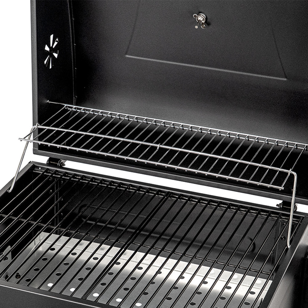 A grillsütő kocsis kivitelű, amely megkönnyíti az elhelyezést és az áthelyezést a kertben vagy a teraszon. Az egyik oldalon kialakított polc előkészítéshez vagy grilleszközök elhelyezéséhez használható. Az alsó tárolópolc további helyet biztosít faszén vagy kiegészítők számára, míg a kerekek segítségével a grillsütő könnyen mozgatható.