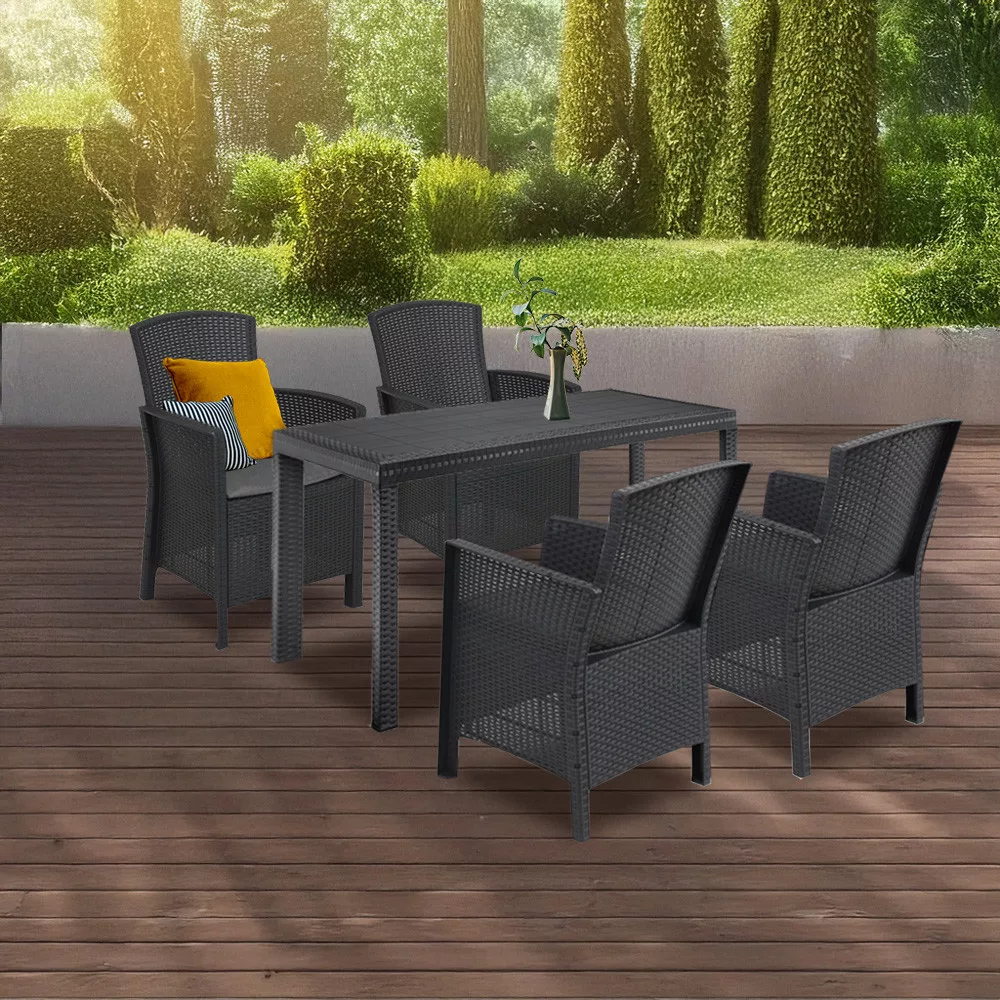Ez a grafit színű, kényelmes és elegáns Hellma bútor szett négy 60 x 56 x 90 cm-es fotelt és egy 90x 150x 74 cm-es négyszögletes magas asztalt foglal magába. Anyagából eredően könnyű tisztítani és mozgatni, ezért bármikor oda teheted ahol éppen szükség van rá, de mégis nagyon stabil és kényelmes ülőhelyet biztosít.