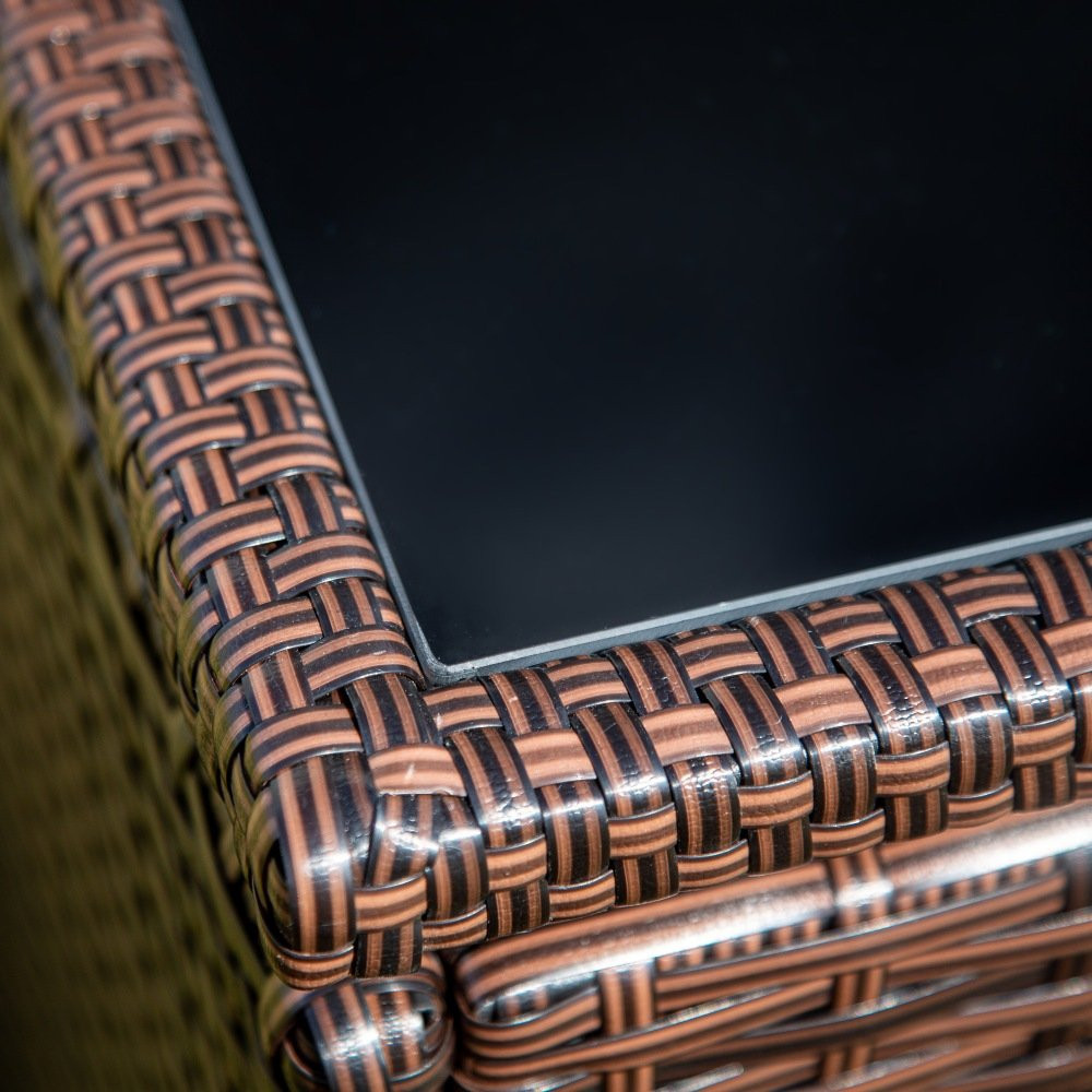 A csomag részei - 4 fotel, 4 puff és egy asztal. Puffok és fotelek becsúsztathatók az asztal alá a kompakt tárolás érdekében. A fotelek összecsukható háttámlákkal rendelkeznek.