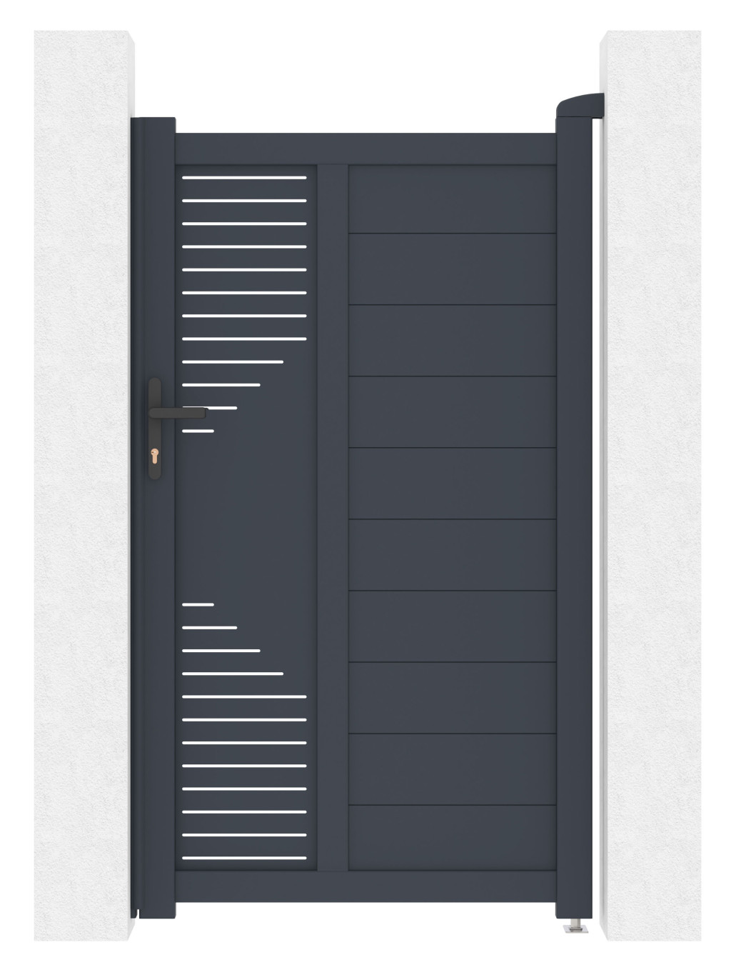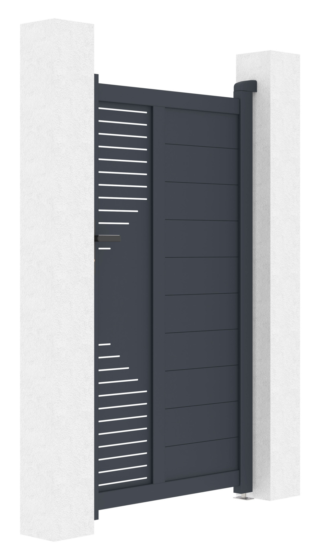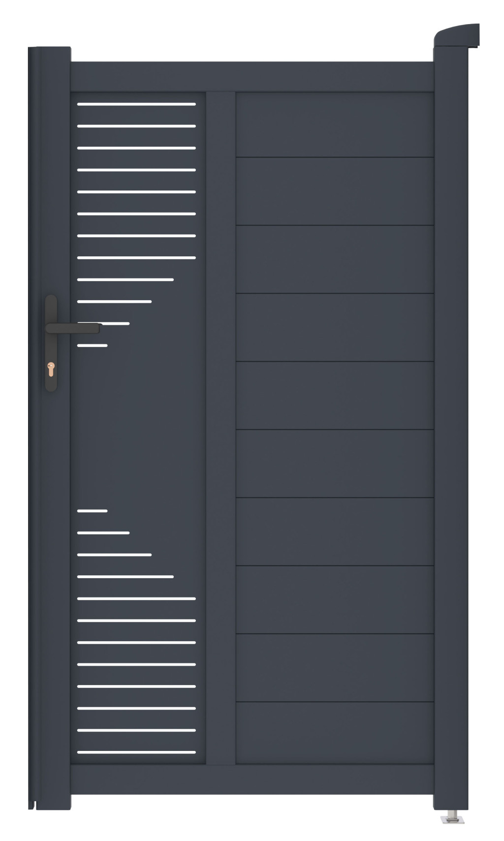 A kerítéskapu kulcsfontosságú eleme egy ingatlan vagy telek kerítésének. A porbevonatnak köszönhetően a 173 cm magas Marion alumínium kapu még hosszabb élettartamú, strapabíró és egyben lenyűgöző és a szélességét a meglévő kerítéshez igazíthatja. Fogantyúnyitás és zár FAB betéttel.