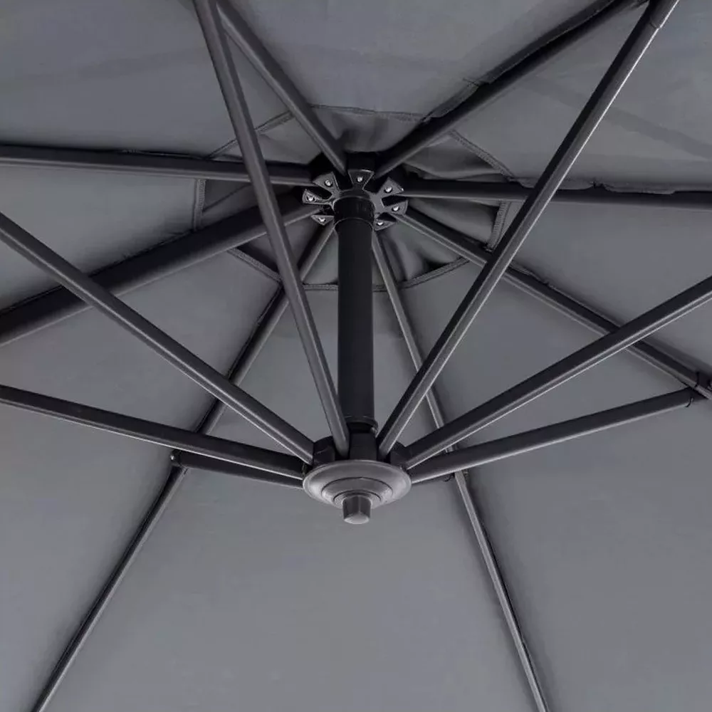 A kerti napernyő stabilitását jelentősen befolyásolja a kereszt talp. Az Ön kényelme érdekében egy rögzített fogantyú segítségével könnyen összecsukható. A napernyő előnye az alapban lévő forgó mechanizmus és a dőlésszög beállítás kombinációja. Ez lehetővé teszi az ernyő tetszőleges pozícionálását és az árnyékoló hely kiválasztását a napfény beesési szögének megfelelően.