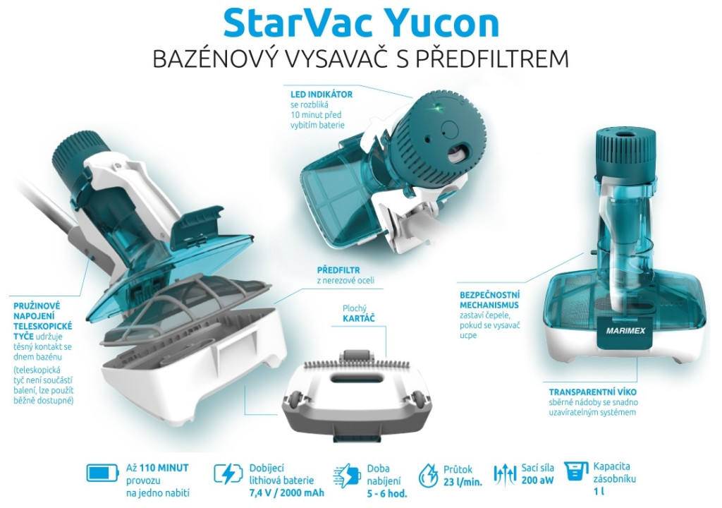 A vezeték nélküli Marimex StarVac Yucon medencetisztító porszívó ideális választás föld feletti és süllyesztett medencékhez 4,57 m átmérőig. Az alsó részén található lapos kefe és rozsdamentes acél előszűrő megbízhatóan felfogja a nagyobb szennyeződéseket. Az 1 literes szennyeződésgyűjtő tartály átlátszó fedéllel van ellátva, így mindig ellenőrizhető a telítettsége anélkül, hogy ki kellene nyitni. A biztonságos működésről biztonsági mechanizmus gondoskodik, amely eltömődés esetén automatikusan leállítja a lapátokat.