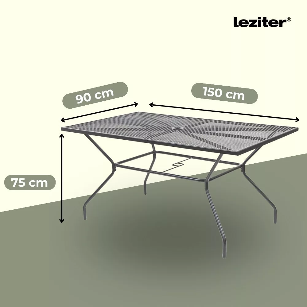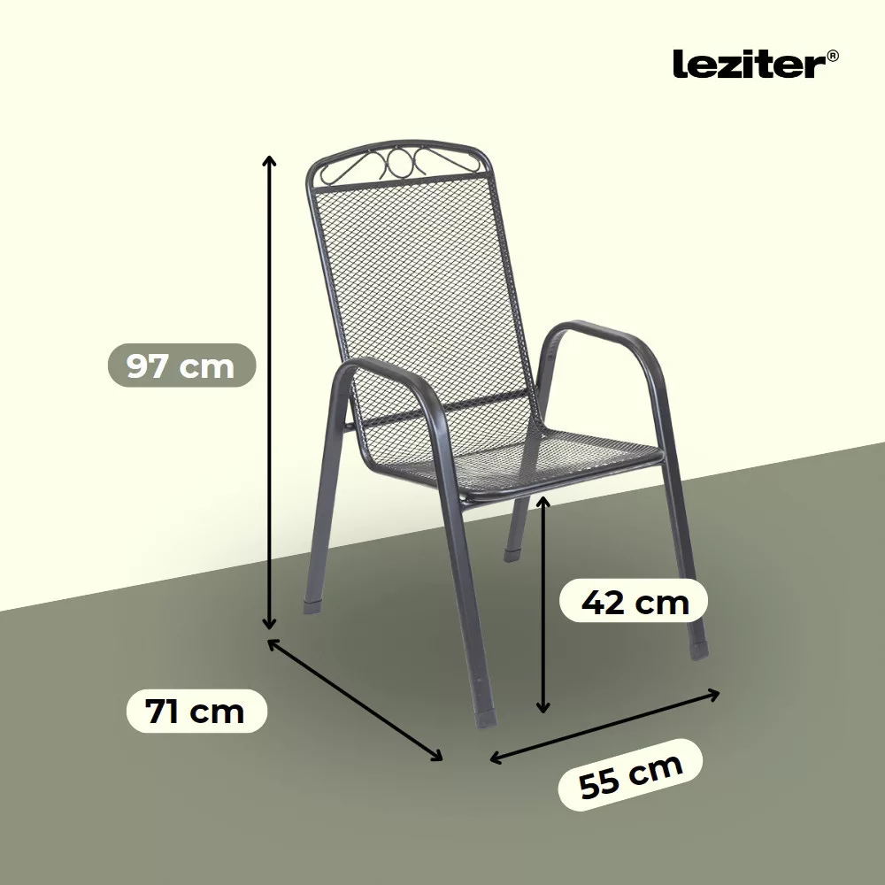 A Melfi 4+1 kerti bútor garnitúra szett antracit színben egy nagyméretű Melfi téglalap alakú kerti asztalt és 4 db kényelmes Melfi karfás széket tartalmaz, stabil acél szerkezetével, korrózióálló és porszórt felületkezelésével, valamint modern hálós kialakításával ideális választás családi étkezésekhez és baráti összejövetelekhez kertben, teraszon vagy erkélyen.