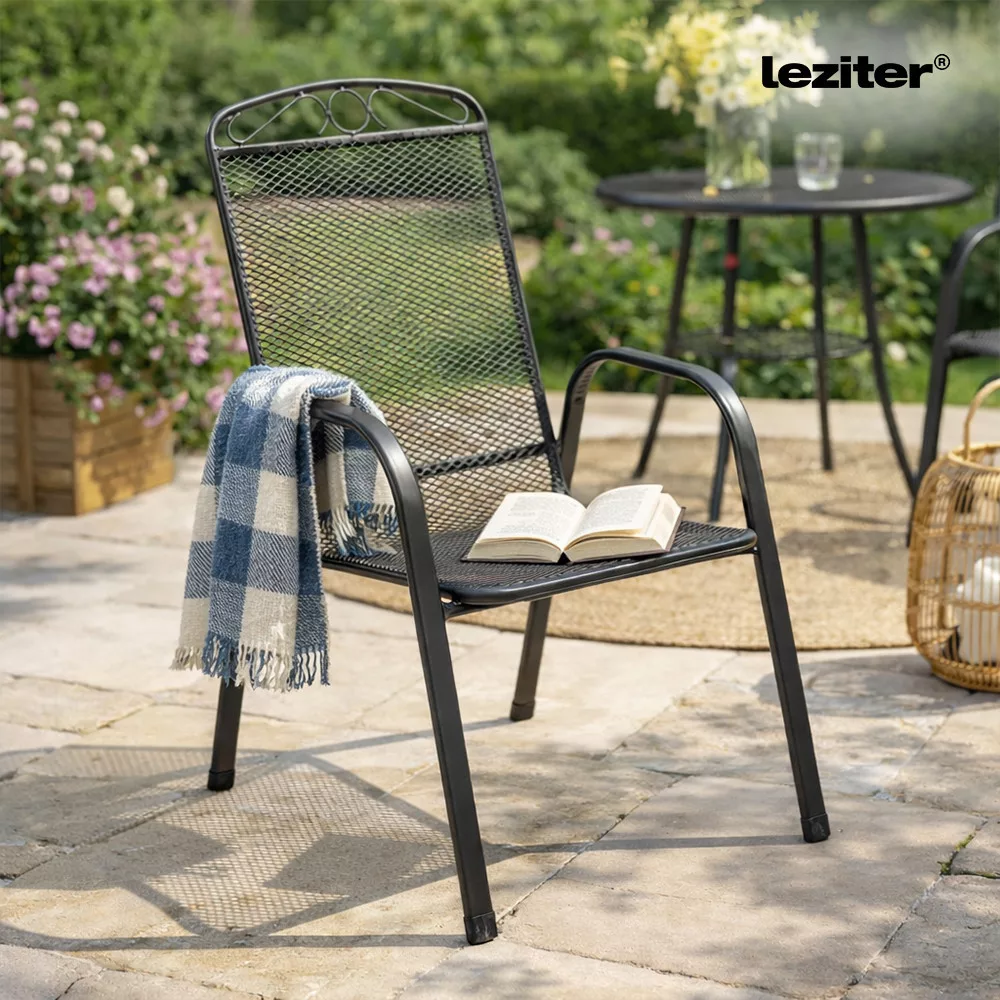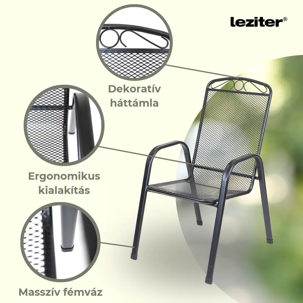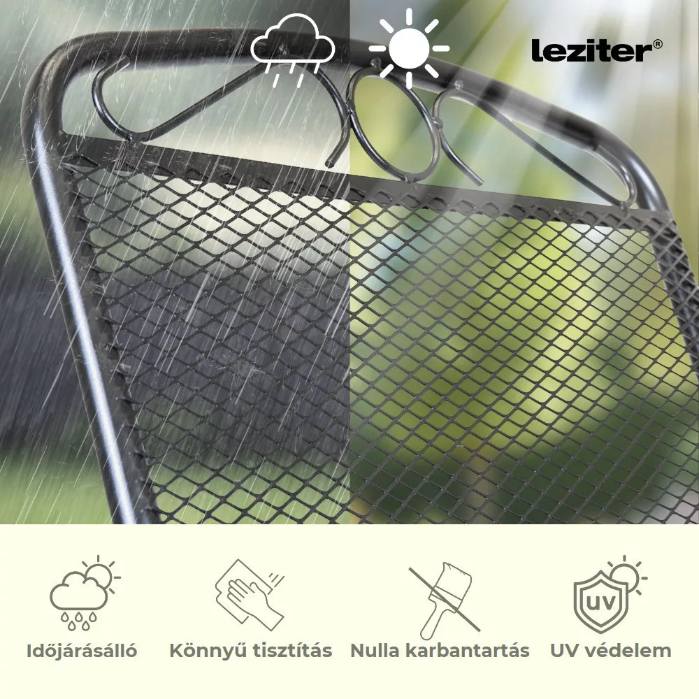 A Melfi fém mesh kerti szék antracit színben stabil acél szerkezetével, korrózióálló és porszórt felületkezelésével, kényelmes karfás kialakításával és modern, hálós ülőfelületével ideális választás kertbe, teraszra vagy erkélyre, és tökéletesen kombinálható a Melfi kerti asztalokkal.