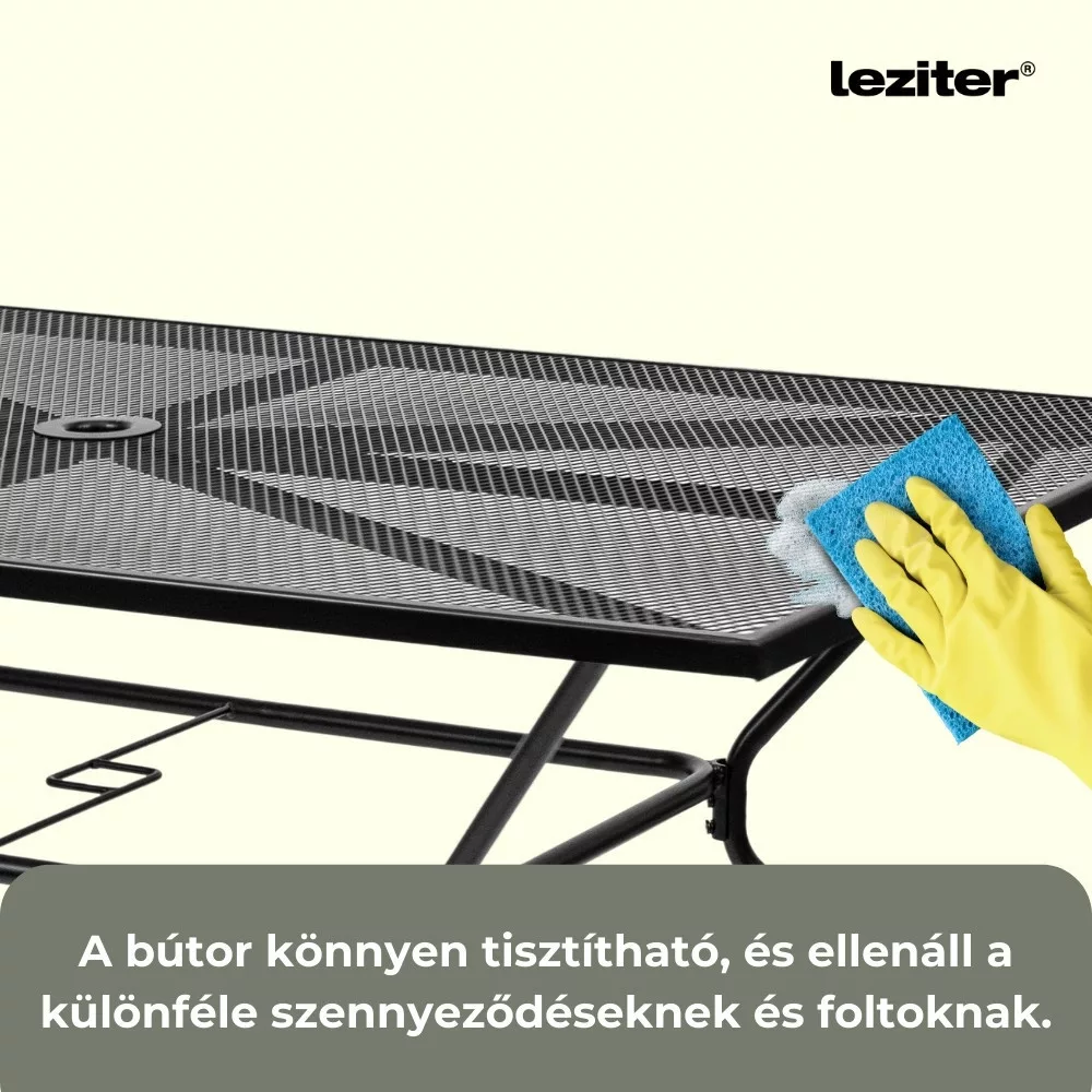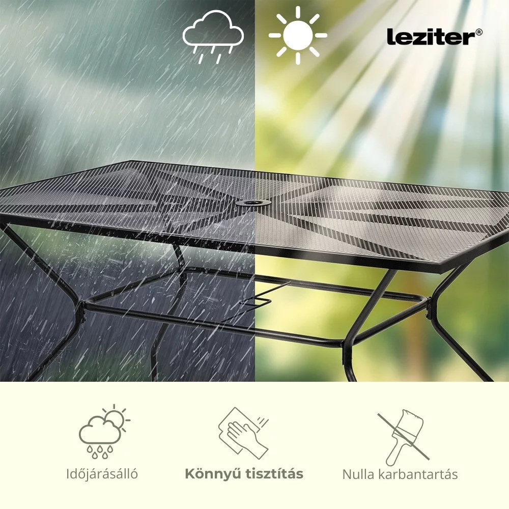 A Leziter Melfi fém mesh kerti asztal antracit színben stabil acél szerkezetével, korrózióálló és porszórt felületkezelésével, praktikus napernyőnyílásával és modern, hálós asztallapjával ideális választás kertbe, teraszra vagy erkélyre.