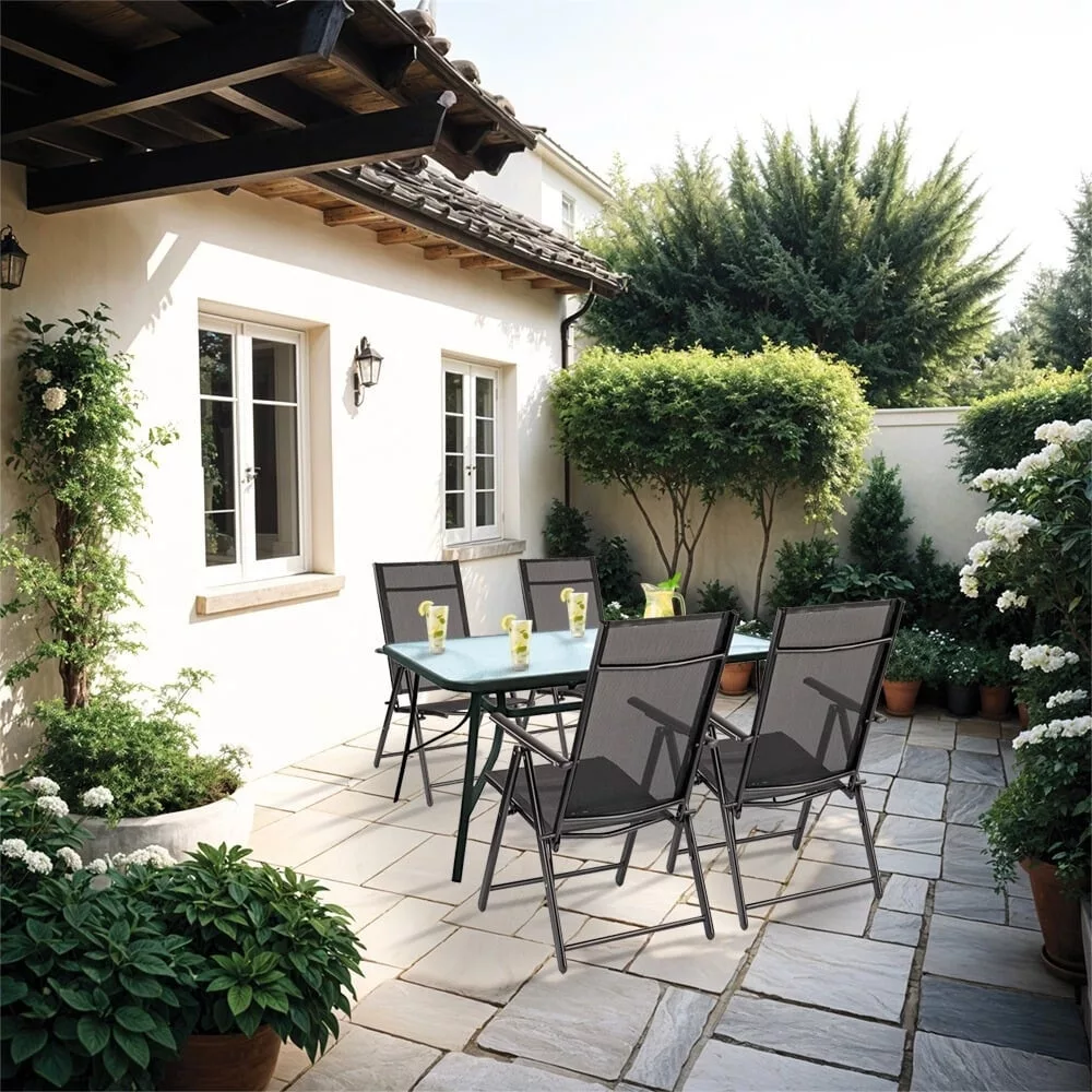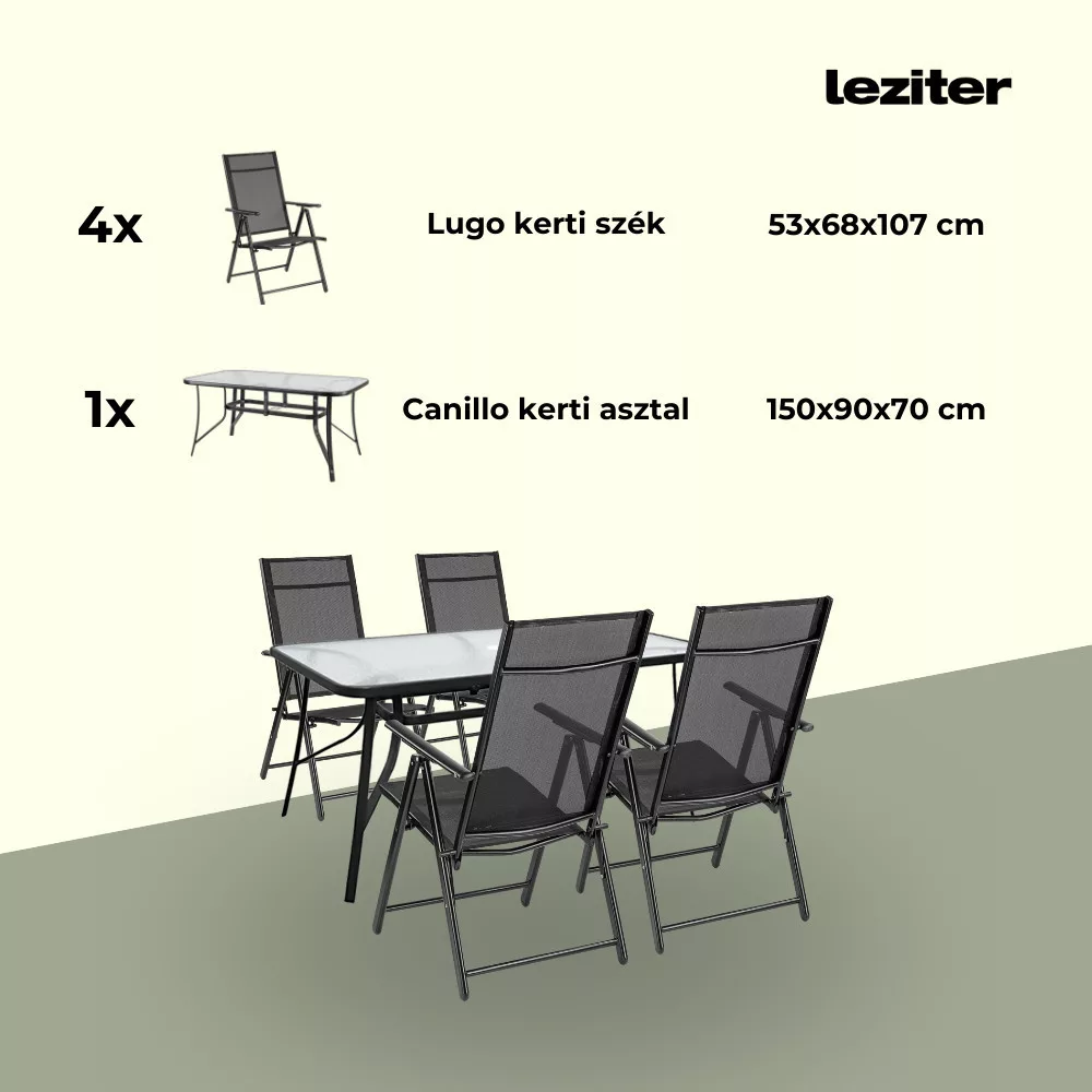 A garnitúra tartalmaz egy téglalap alakú, 150x90 cm-es üvegasztalt, valamint négy Lugo összecsukható fémvázas kerti széket, amelyek 7 különböző pozícióba állíthatók, hogy a lehető legkényelmesebb ülést biztosítsák.