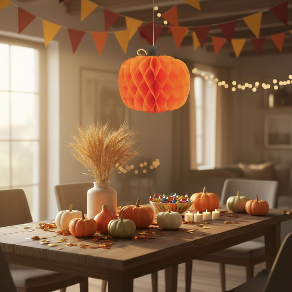 Dobja fel otthonát ezzel a stílusos, őszi hangulatot idéző lampion tökkel! A méhsejt kialakítású, papírból készült dekoráció könnyed, mégis látványos kiegészítője lehet bármely őszi enteriőrnek. Klasszikus narancssárga színével és sütőtök alakjával kiválóan illeszkedik Halloween-i vagy egyéb őszi dekorációkhoz. Könnyen összehajtható és tárolható, így évről évre újra felhasználható.