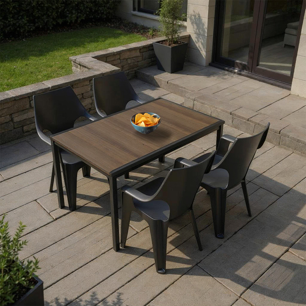 A Parker 4+1 kerti bútor garnitúra tökéletes választás, ha szeretnéd, hogy a kültéri étkezés ugyanolyan kényelmes legyen, mint bent a lakásban. A dió színű, fa hatású asztallap meleg hangulatot visz a kertedbe vagy a teraszodra, míg a grafitszürke székek stílusos, modern kontrasztot alkotnak vele. Egy ilyen szett nem csupán funkcionális – harmonikus központi eleme lehet bármely kültéri térnek.