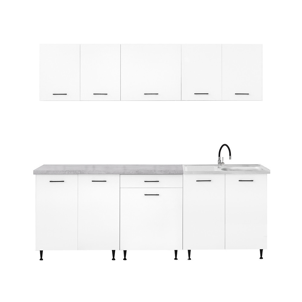 A 220 cm széles konyhabútor három felső és három alsó elemből áll, amelyek praktikus tárolóhelyet kínálnak a konyhai eszközök számára. A két 80 cm széles alsó szekrény alkalmas nagyobb edények vagy konyhai kellékek elhelyezésére, míg a 60 cm-es fiókos–ajtós elem jól használható evőeszközök és kisebb tartozékok rendszerezésére.